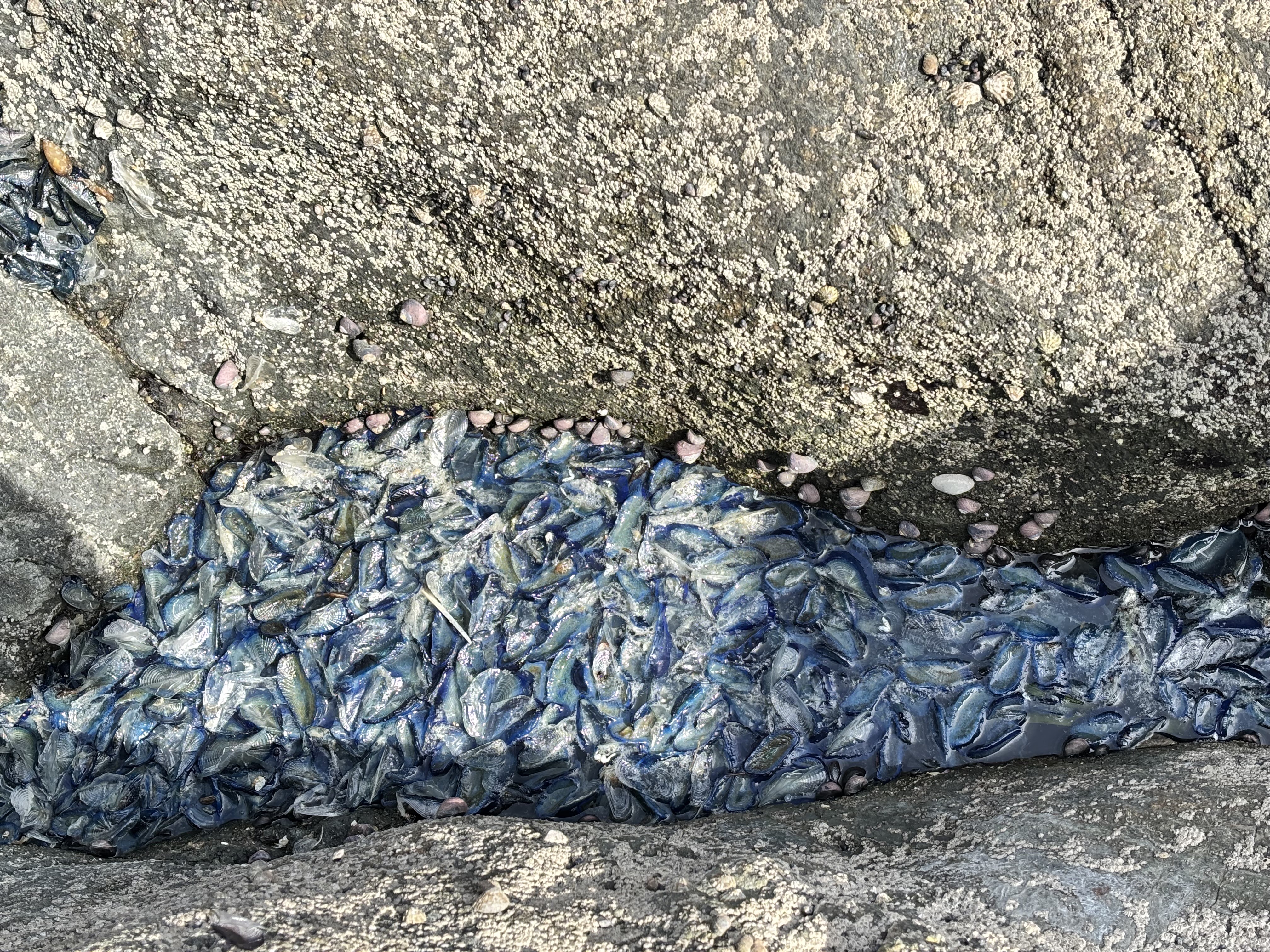 Tons of by-the-wind sailors in tide pools and dried out on surrounding rocks