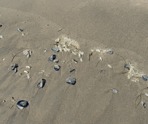 36.940 / -121.960 | Lots of washed up by the wind sailors, some still blue |