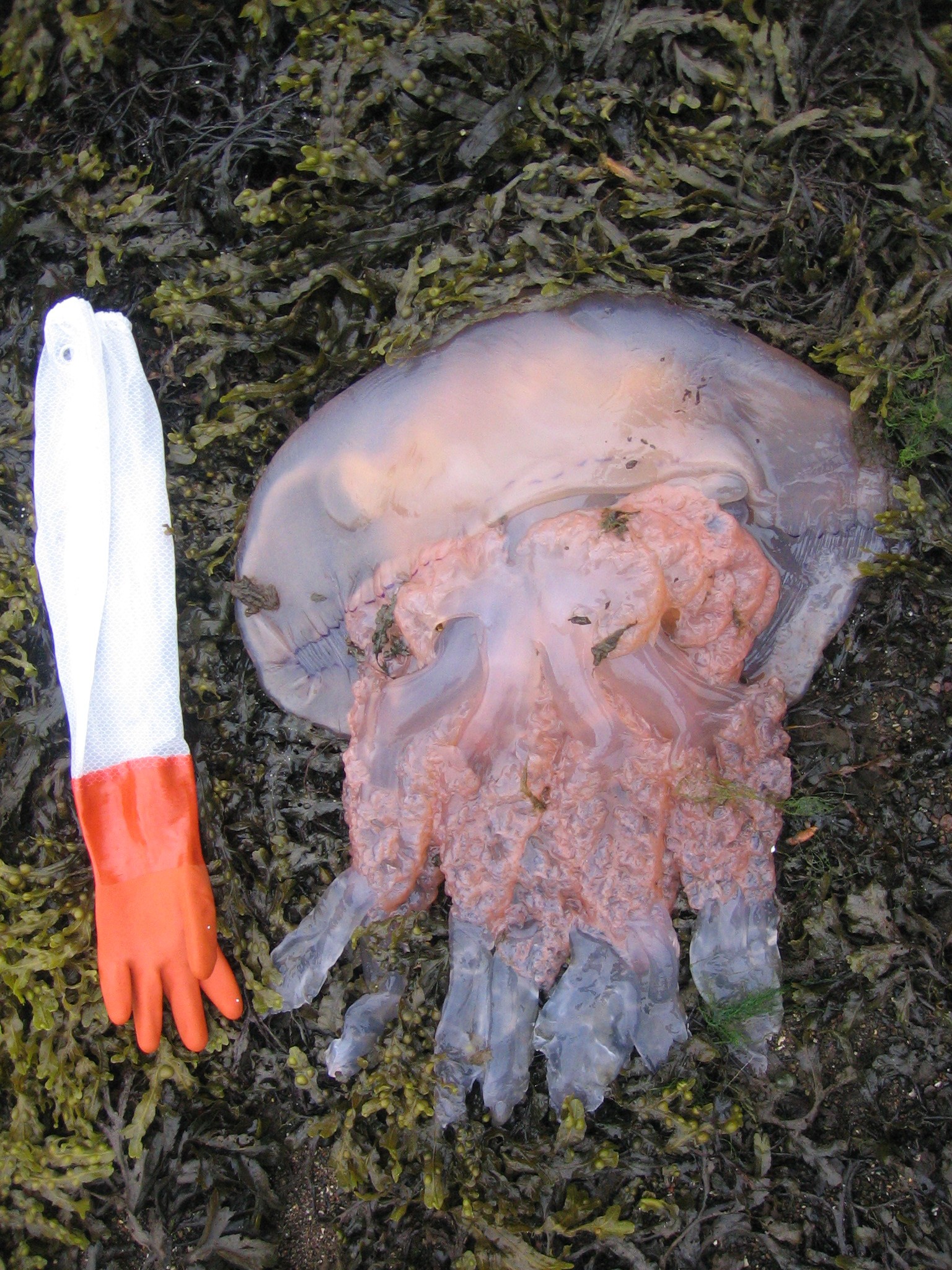 The jellies are really starting to show up in Oban now. The guy was right - I'll "not be bored." Many of the big female Cyanea capillata are brooding planulae now. I have been seeing about 5 or so specimens per day lately, but today I saw about 20. There were the usual 50+ moon jellies, Aurelia aurita. But the Big score of the day was a great big Rhizostoma octopus (see the picture). This one was a male I'm hoping to find a female soon... I'd like to start a fresh culture of them if I can.