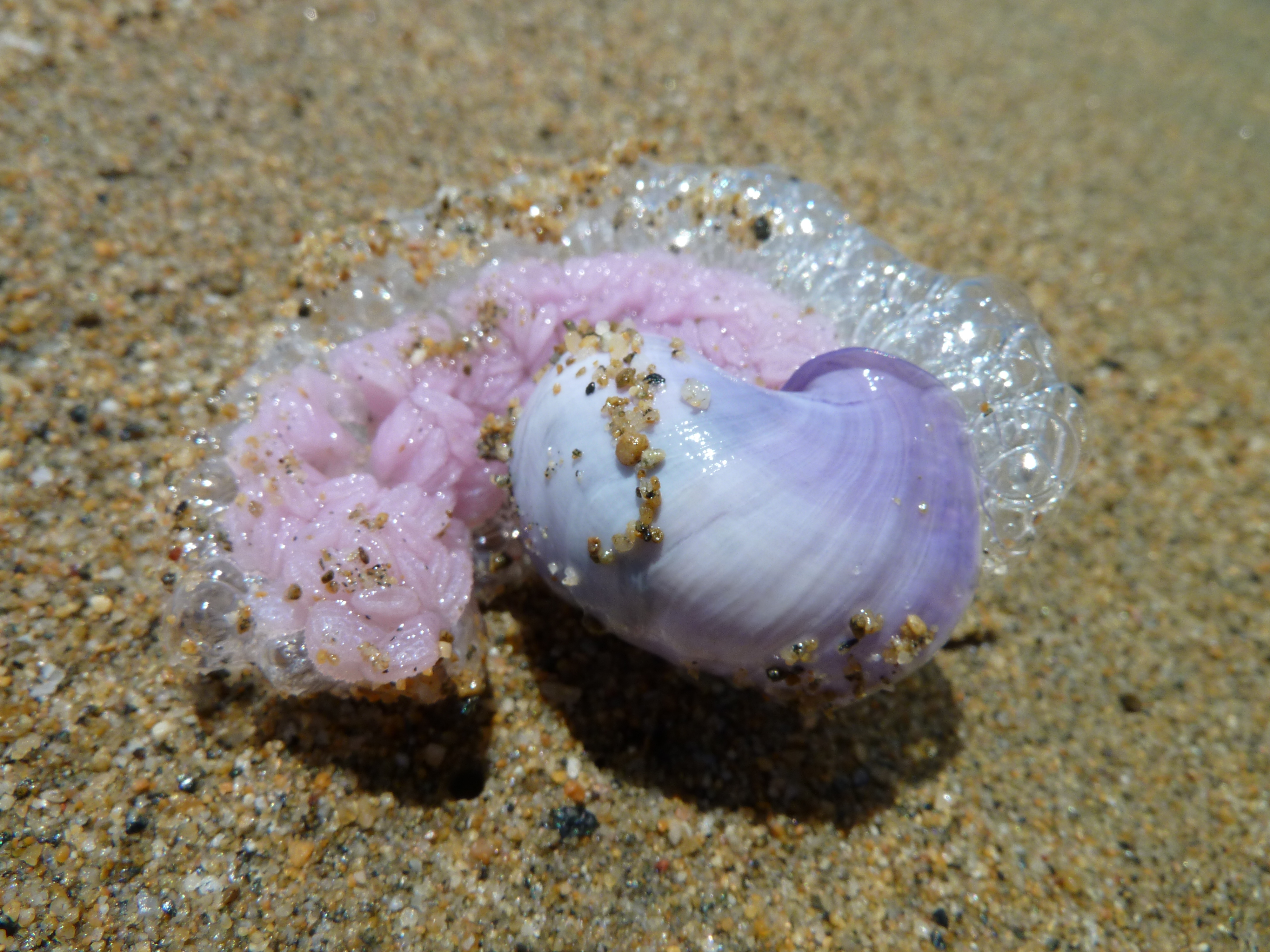 following several days of high winds and semi-stormy weather we were finally able to return to the beach, despite some winds. we found that there was another mass beaching of the floating medusa velella. there was also what looked to be a moon jelly washed up on the beach. but most interesting for my wife and i was there was something new that we had never seen before, and her being a native to the area. she discovered on the internet that it was a violet sea snail. there were several dozen washed up, as well as hundreds of the medusa velella. i will upload a picture.