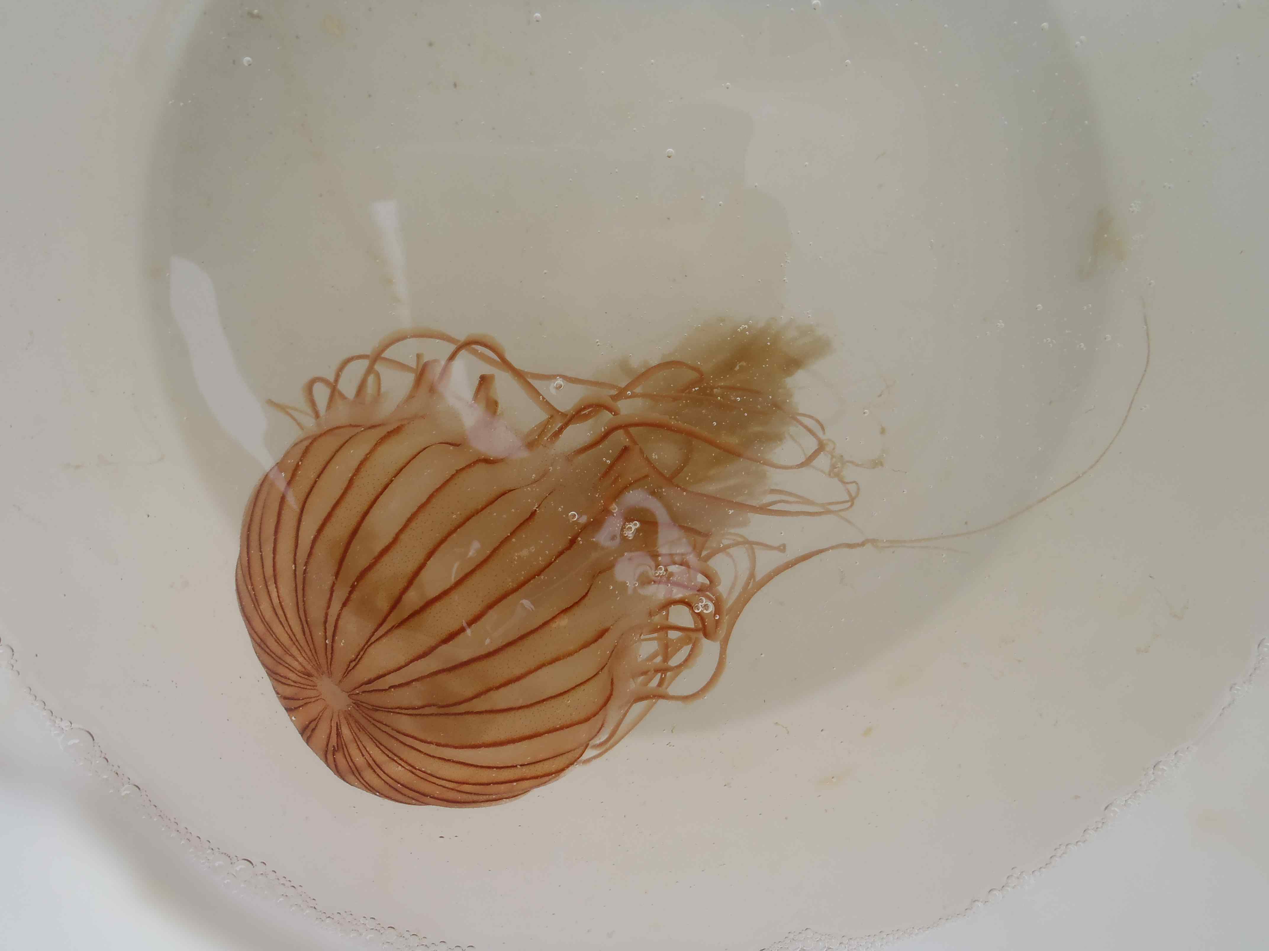 A couple of Chysaora sp. jellyfish, about 10 cm bell diameter swimming near the surface, a couple km offshore. Water temperature 14-15°C.