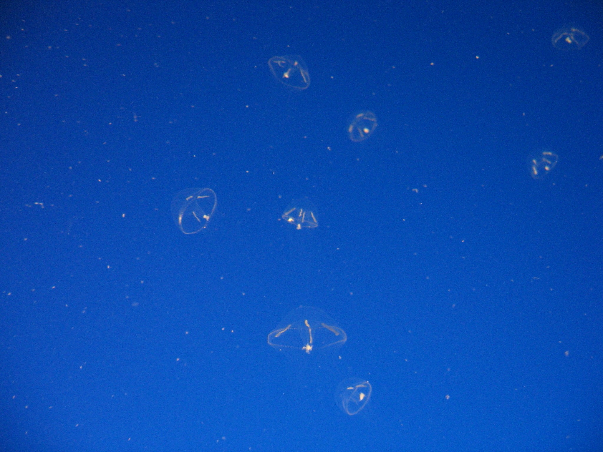 We did a plankton tow for the Monterey Bay Aquarium about 1/4 mile off Point Pinos in Monterey Bay, California yesterday morning. We did not see any large scyphozoan medusae, but did see lots of little hydrozoans, and the ctenophore Bolinopsis infundibulum as well.