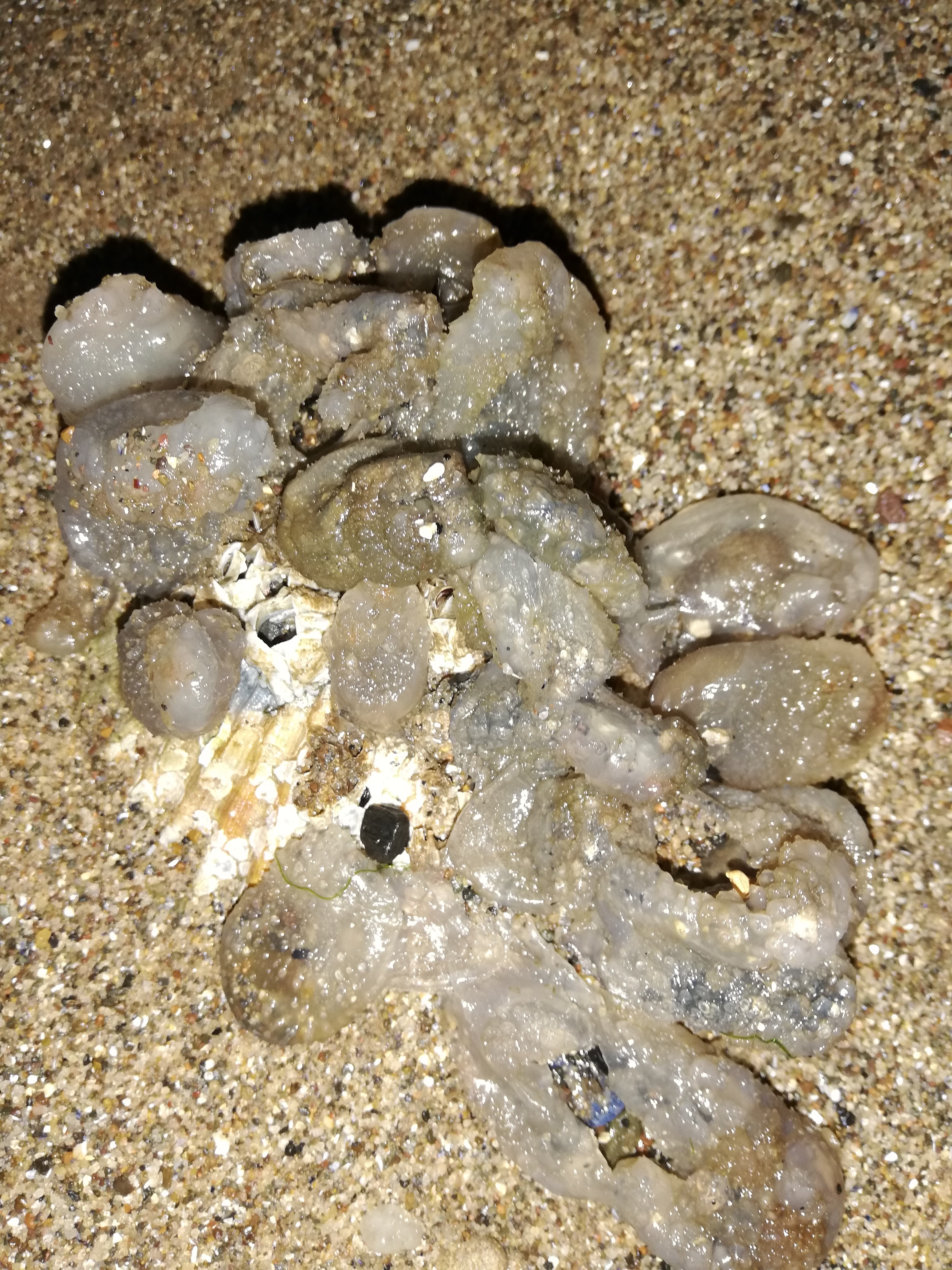 Conditions at the time were cold and dark due to it being winter at the time in Scotland, and the tide seemed to be at its lowest so an extensive stretch of sand was present. The sandy beach in Musselburgh was littered with various small hard surfaces (like stones and shells), all of which were covered in what seemed to be gelatinous eggs.