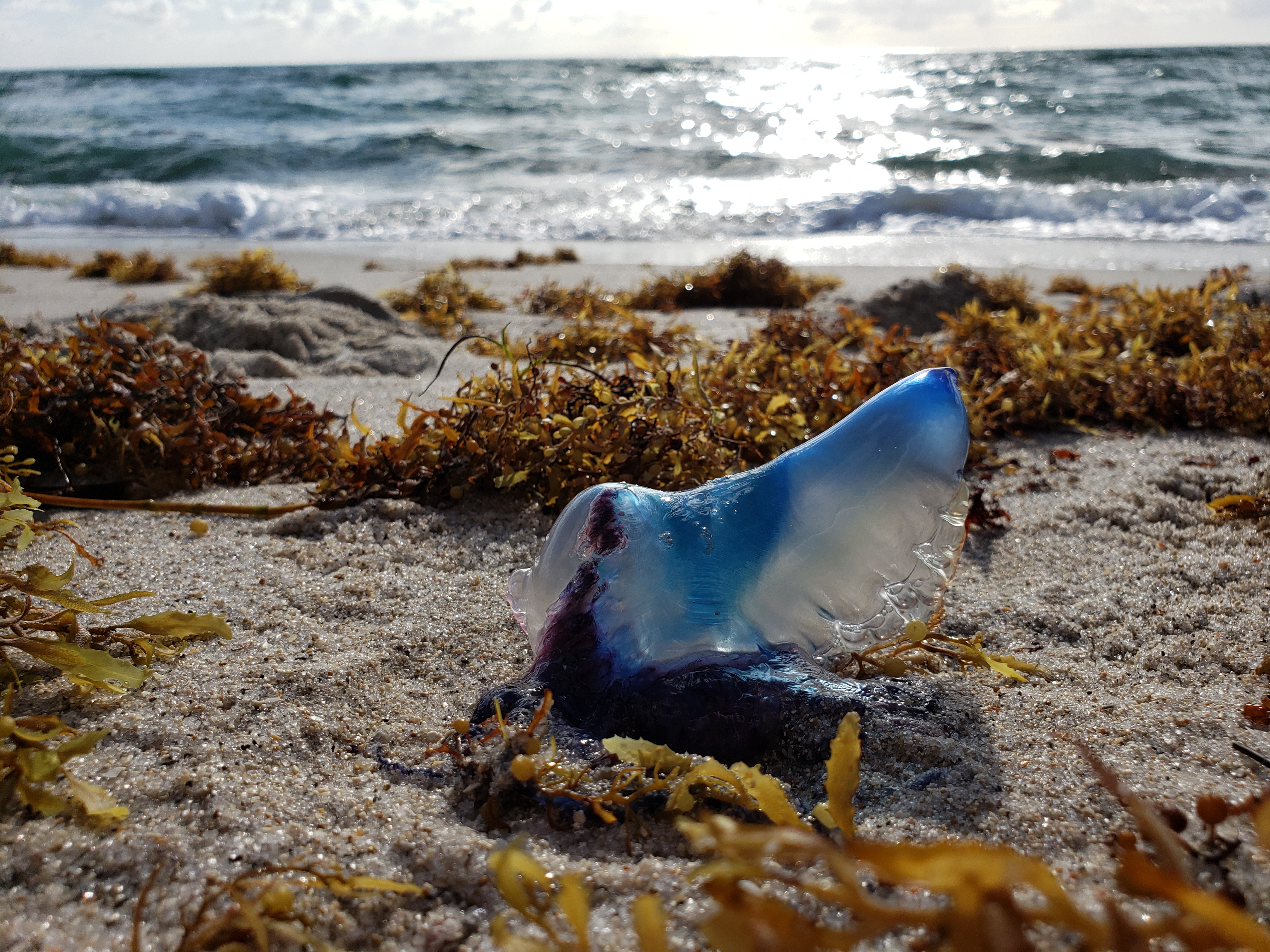 Washed ashore and lying in a bed of sargassum seaweed at 9:00 a.m., this Man o'War was quite alive. I moved the seaweed aside to see more of the jelly and rinsed it with sea water. There was a second jelly in the same condition about thirty feet or so away. The lifeguard thought the sightings were unusual because the winds were opposite of what normally bring the Man o'War to that area of Miami.