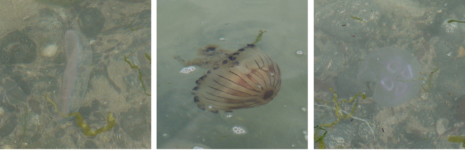 Small swarm (10ish) of compass jellyfish in shallows and washing-up. Two Aurelias. One Aequorea with unusual pink coloration (ones I've found have always been crystal-clear - different species?).