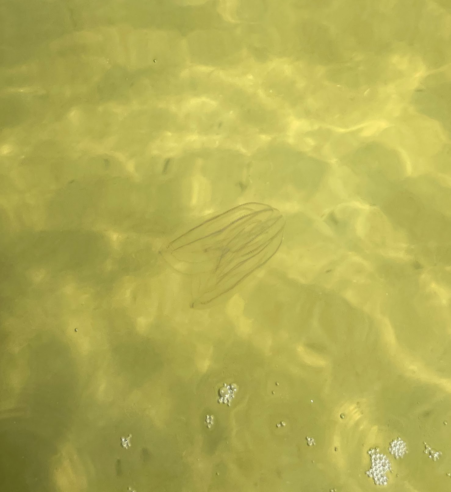 This is a comb jellyfish I saw in Tampa, Florida. I think it may be a sea walnut. All the jellyfish were in good condition, but they did not move, and I couldn't tell whether they were alive or dead.