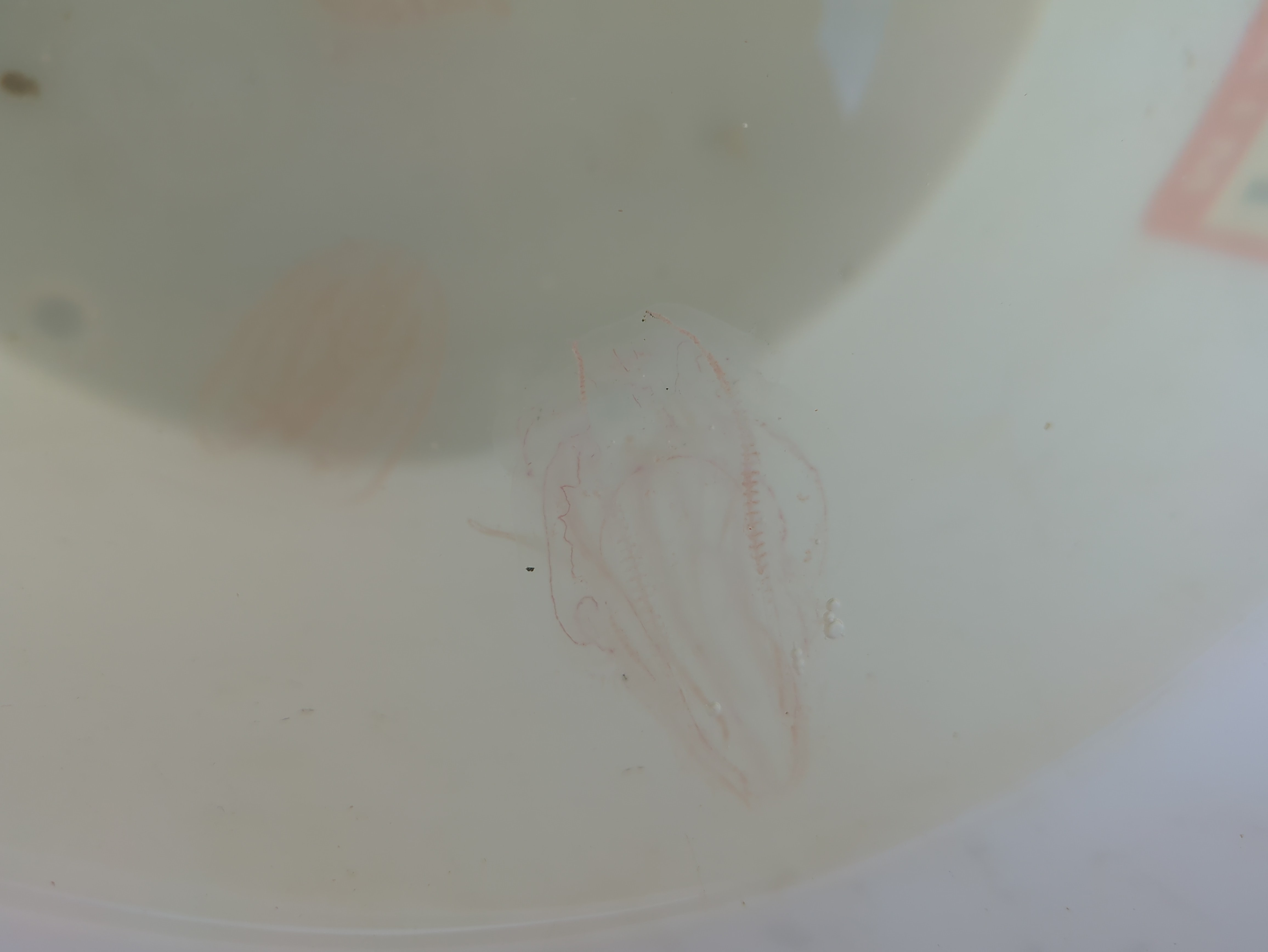 1.5 to 2 inch translucent comb jelly with mauve/pink veining along length of bell