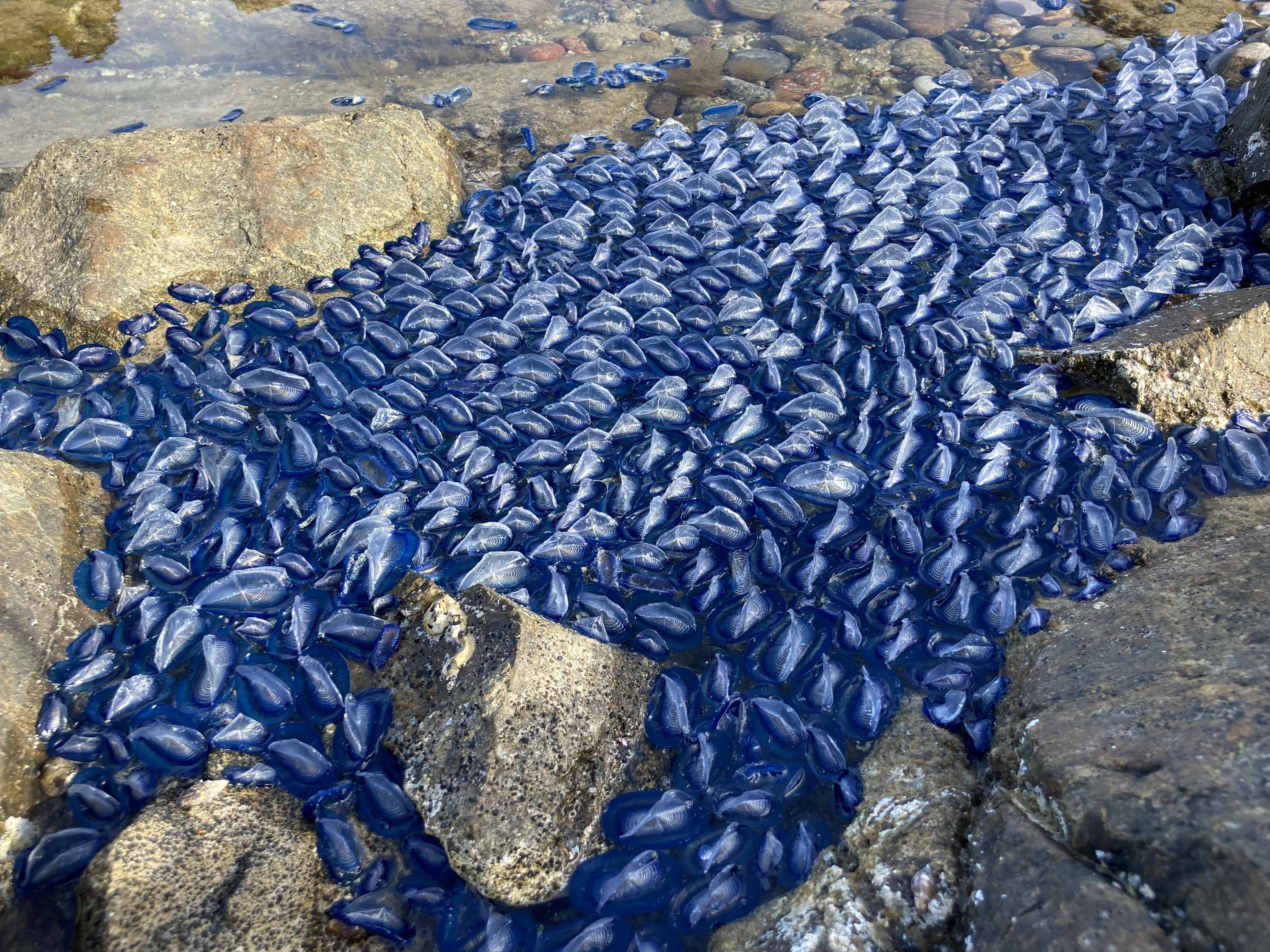 Thousands of live, dead and floating velella on a pebble beach close to the Plage de Figa on Corsica