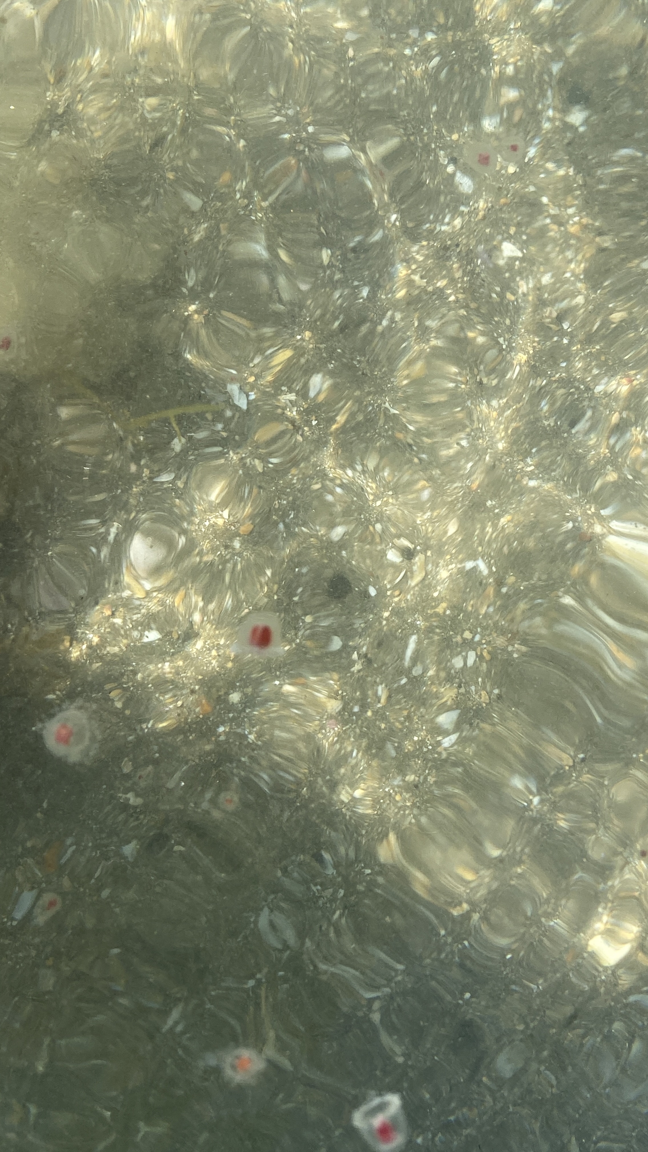 During the Christmas holiday, many people came to the beach for swimming, including us. However, I noticed an alarming number of jellyfish larvae in the water, which made me feel uneasy.