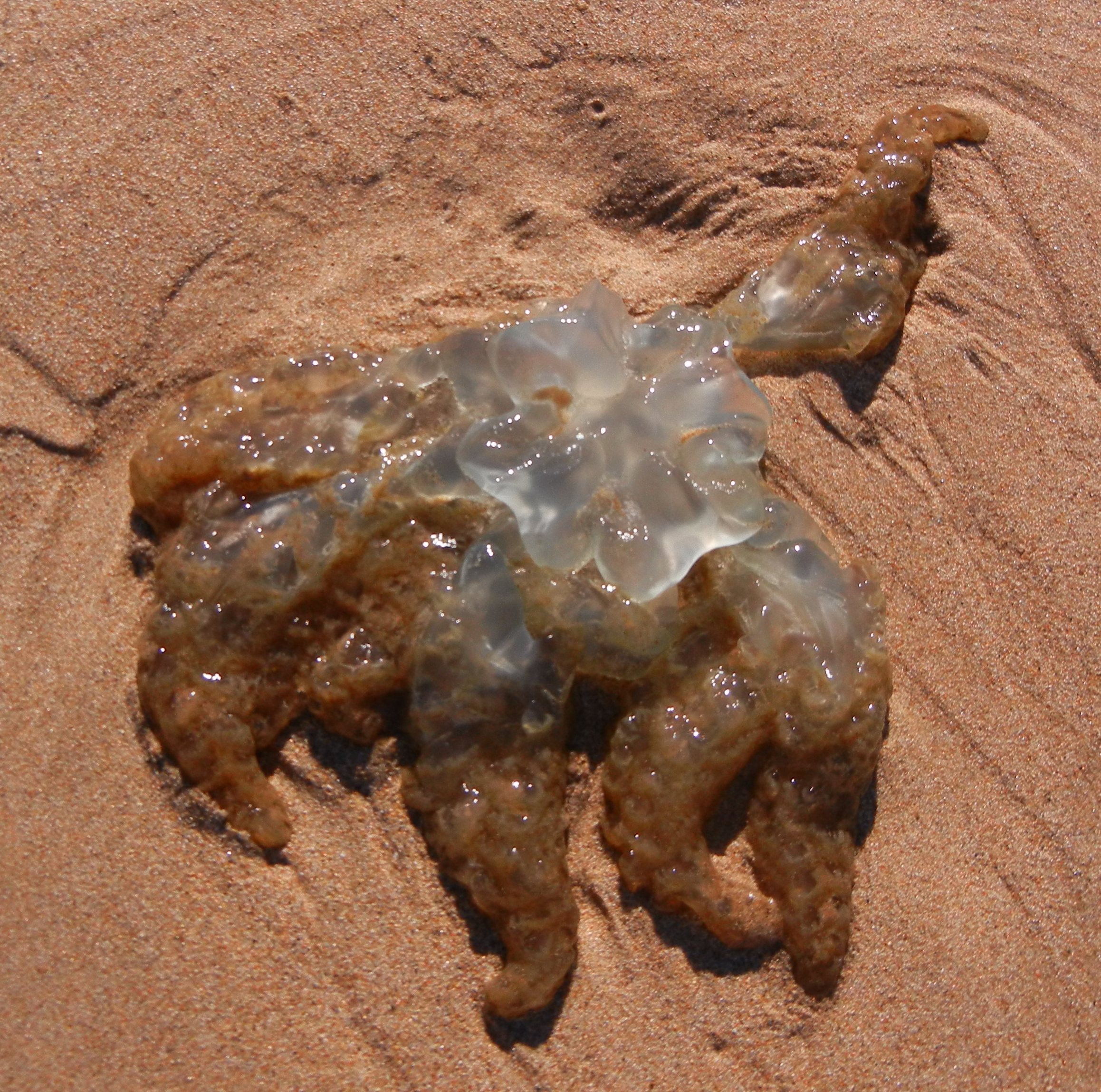 30 or more jellyfish and bits of jellyfish washed up on b