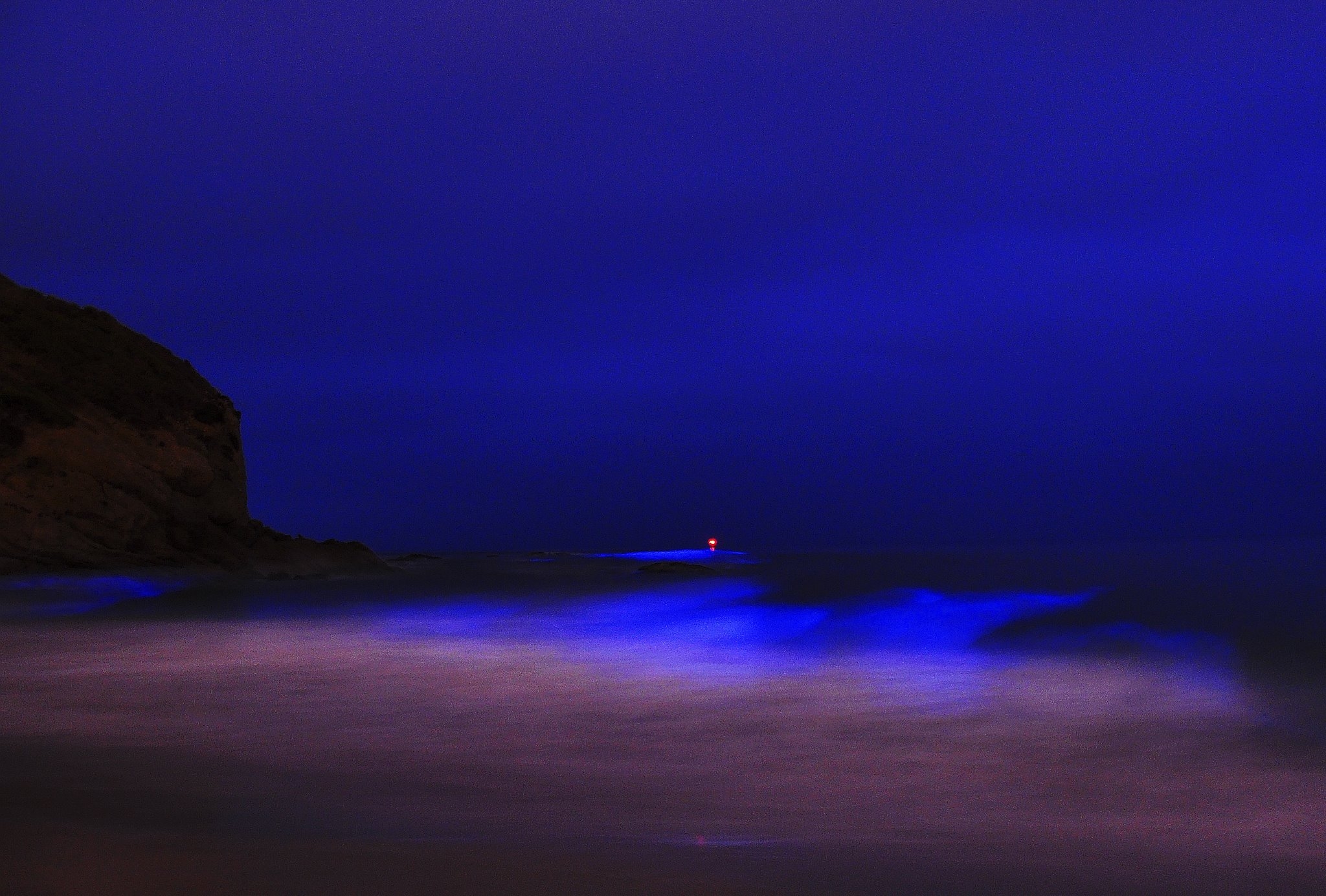 Electric blue flashes of light from crashing waves. Likely to be a bloom of the Lingulodinium polyedrum Dinoflagellate.