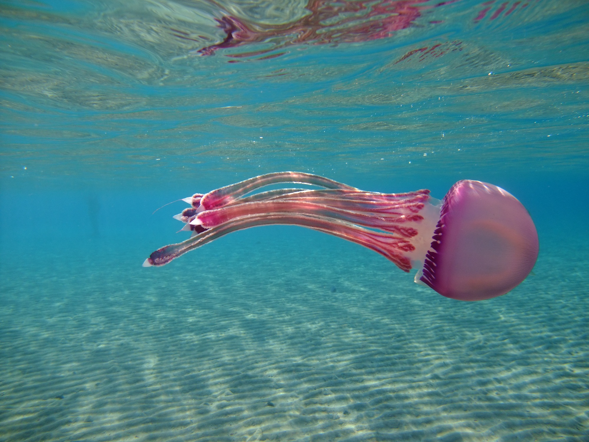30 cm long Very shallow, 1m depth water. sandy bottom, with some see grass. Lot of green turtle eating other types of jellies.