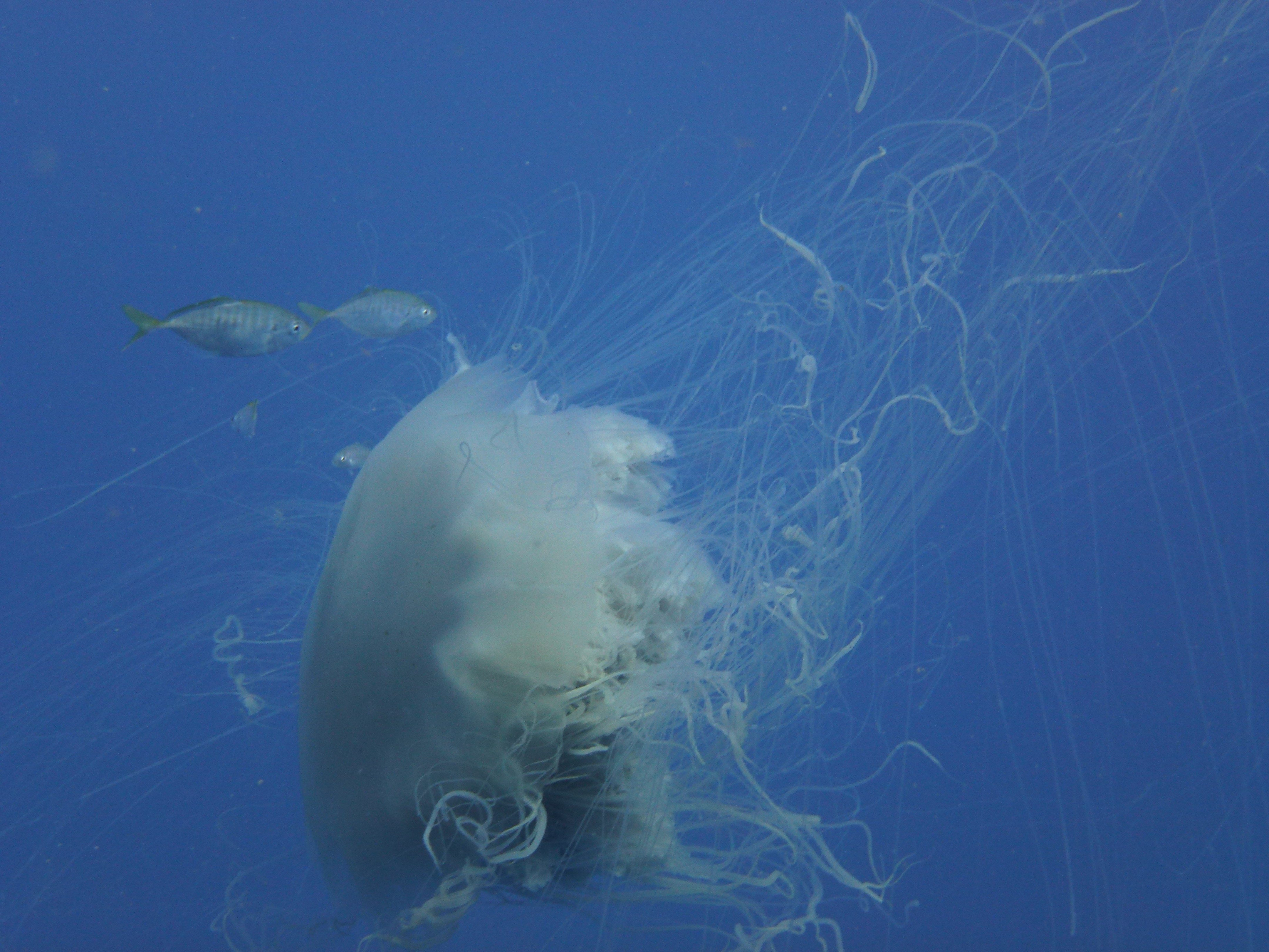 One of our favourite instructors at Peri Peri Divers, Nick, has given these jellies the nickname 'Corpse-bride Jellyfish' and that is what we are all calling them now. We have also seen a few leatherback turtles around since these jellies arrived 2wks ago. They are large (dinnerplate size) with many very long tentacles which sting only very mildly, are fine and break off easily.
