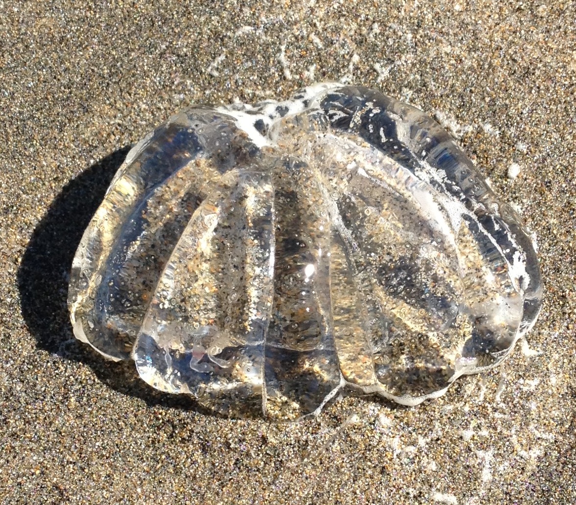 Jelly discovered on Ocean Beach in San Francisco with a somewhat ribbed texture. Maybe 4" across.