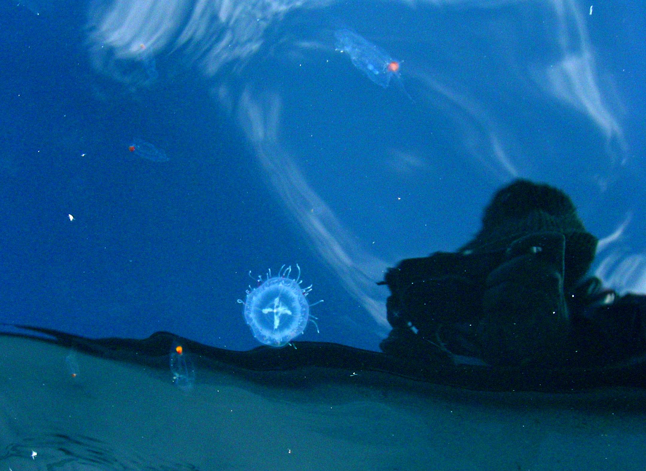 Related observations: I have seen small aggregations of similar medusae at the sea surface and washed up on the beaches of Monterey Bay over the past 3 weeks. Also, saw chains of salps (Salpa) just outside the surf zone at Moss Landing State beach on April 27.