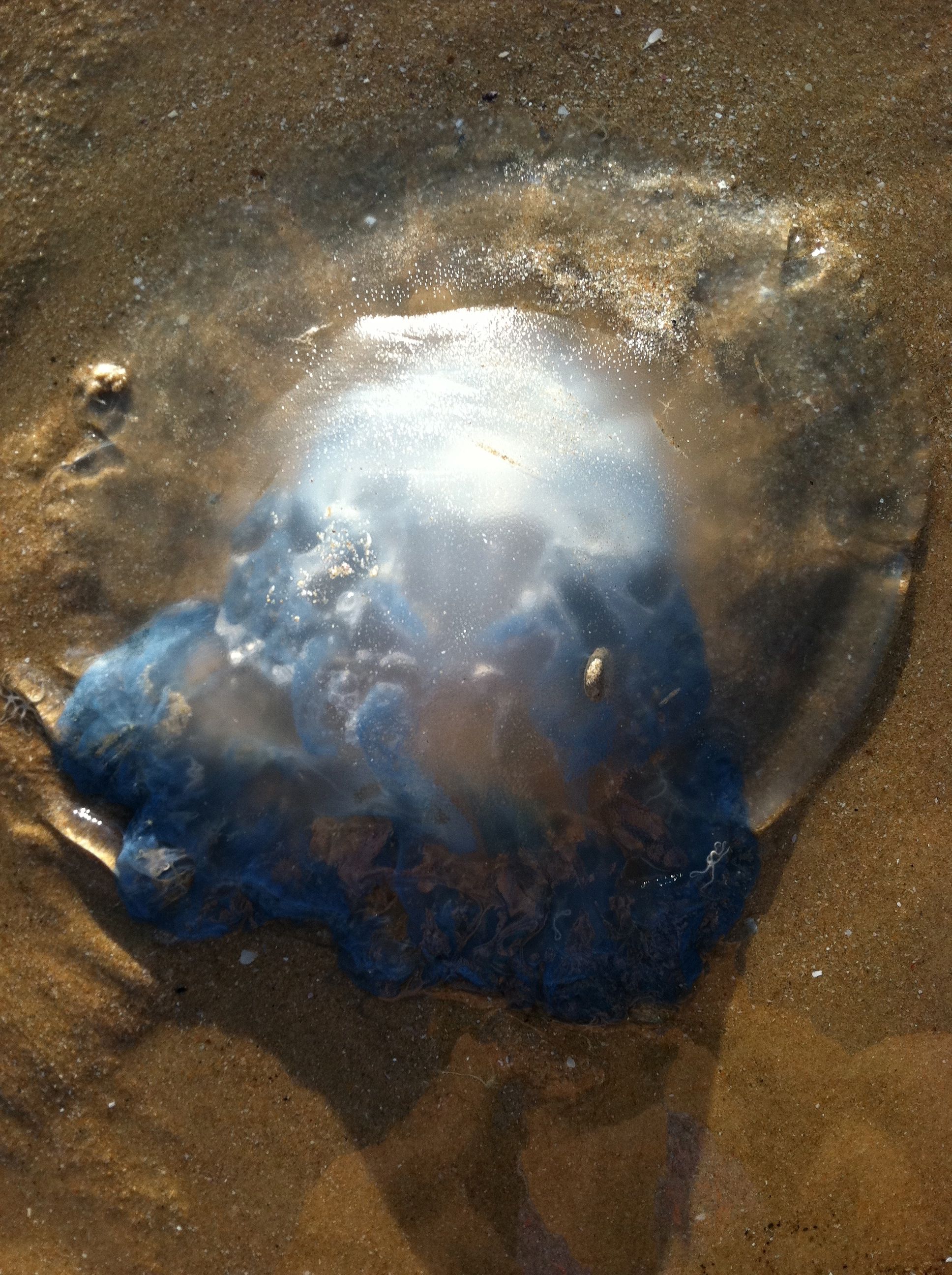 low tide today 18/5/12, over 100 blue jellies along 3 kms of coast, all with a disc diameter of +20 cm, have the 4ring symmetry, not apparently long tentacles. bumpy nobby top surface. brittle stars living in each of them