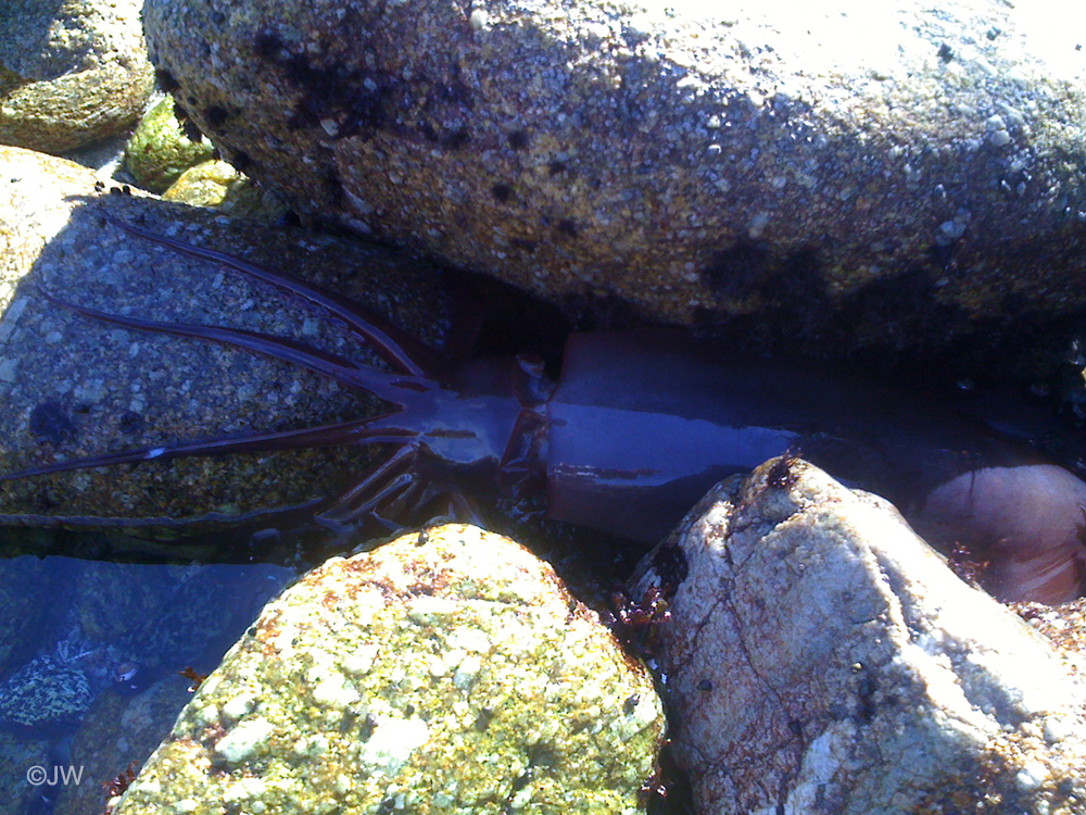 Today, around 1pm I watched this large squid propel itself out of the water, into the inter-tidal. I was sitting roughly 1km south of Hopkins Marine Library, in Pacific Grove. It was swimming erratically and bashing into the rocks. Within a few minutes, it lodged itself among some rocks and was exposed to the air/sunlight for roughly 5 minutes. It became lethargic (though still breathing) and I noticed numerous hermit crabs and other larger crabs feeding on it. I gently shifted it out of the rocks and to my surprise, it started swimming and moved further out to sea. I don't believe it survived for long.