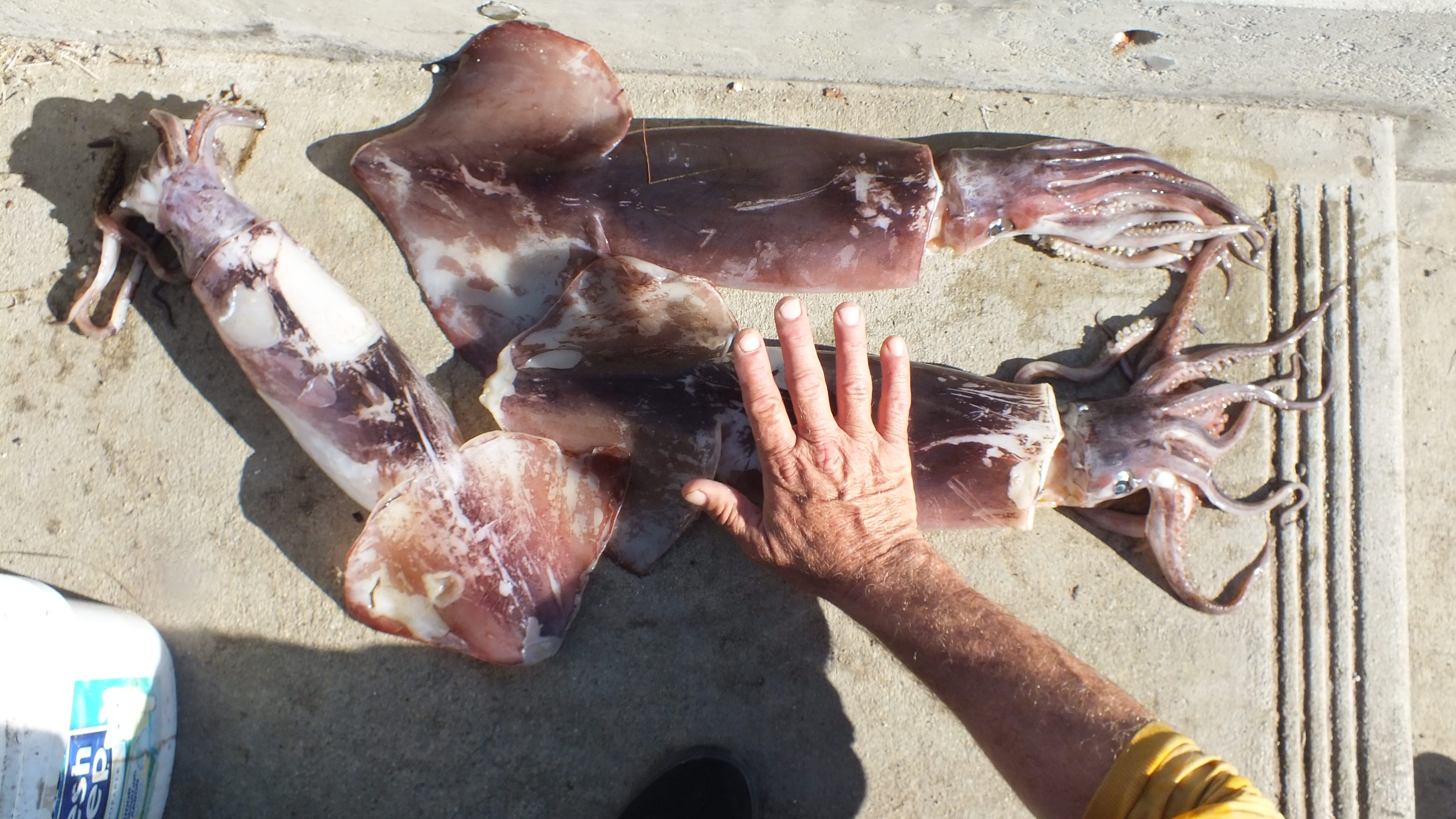 Dozens of dead Humboldt Squid are just now (11 a.m. local time) washing among the rocks along West Cliff Drive near the statue of the surfer. Some people are pulling them out for a better look and to see what might be the cause.