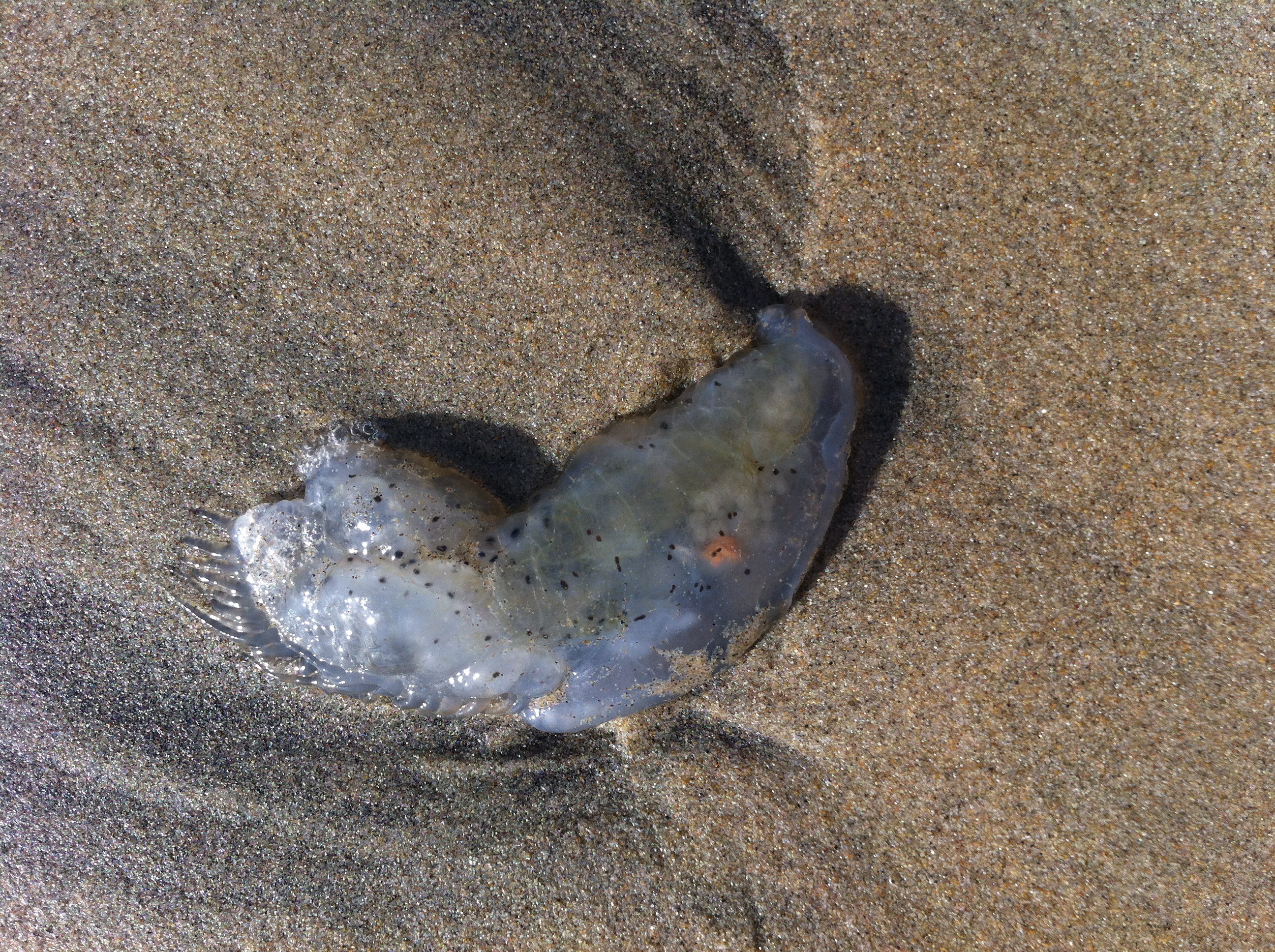 Many greyish purpole jellies on del Monte beach, Monterey, CA