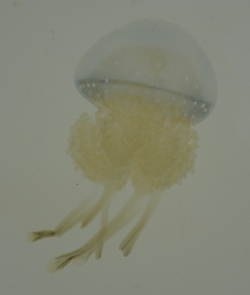 approximately 5", clear top with white/bluish spots over entire head and body. Rufflely body, also with spots. 8 'tentacles', three had ends that phosphorized in the sea water, showed as dark spots with white background. Located in Marina Palmira, La Paz. Fairly clear water, only one jellyfish noted. I have several images in addition to the one attached. Would like to know the name of this, please.