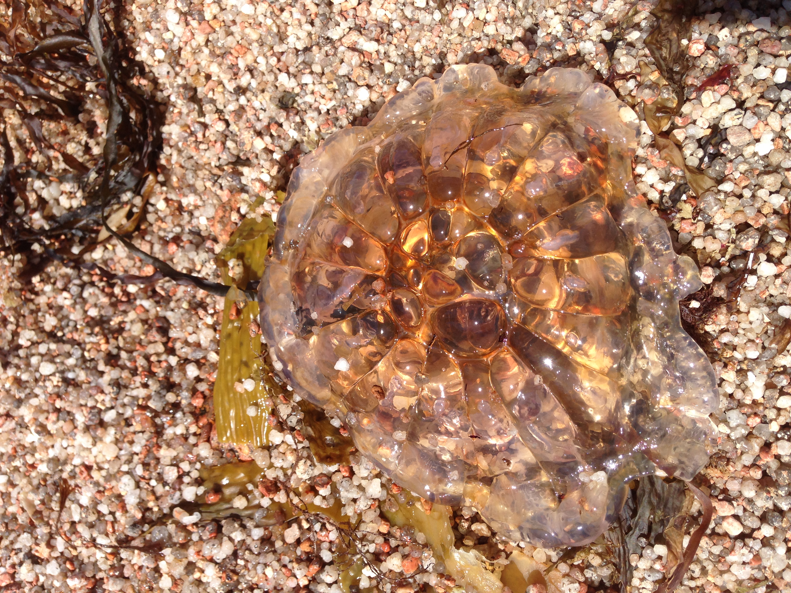 Saw three jellies washed ashore in Sleepy Bay, Freycinet National Park, Tasmania. All appeared to be the same species (although not sure what that is) and the largest (attached picture) had a bell of ~15 cm in diameter. The other two were slightly smaller, with bells of ~10cm. Ocean was calm and clear - not sure how long the jellies had been there.