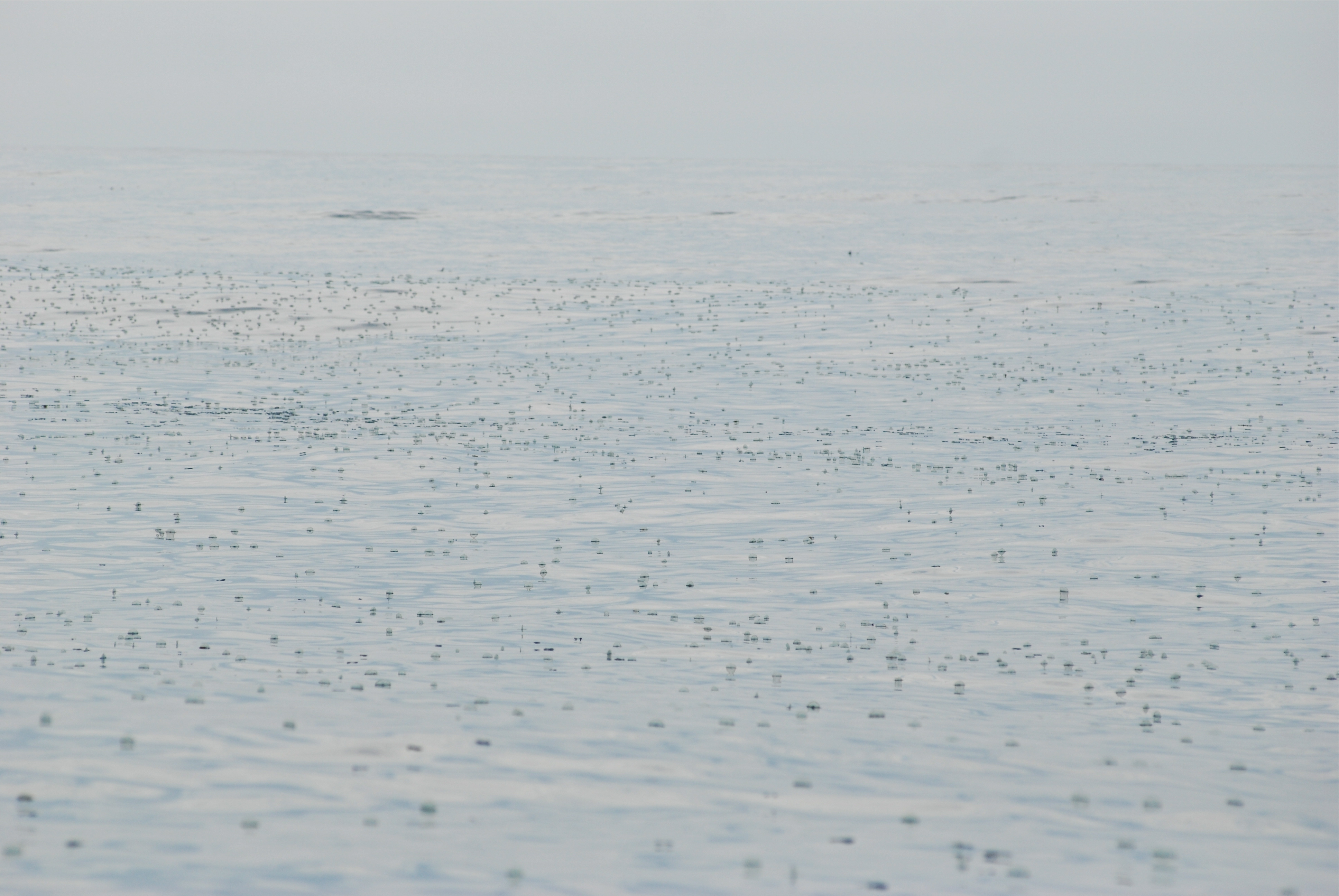 The surface of the water off the west coast of Vancouver Island at Swiftsure Bank was covered in large patches of Velella velella both days I was out there.
