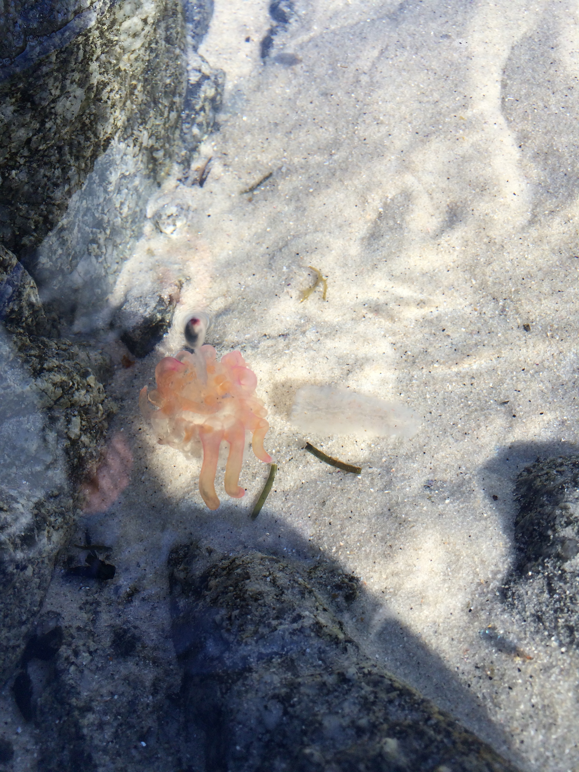 We found a clear jellyfish like body with pink and peach tentacles washed up on the sand. We moved it to a tide pool when a clear center tentacle with a "red eye' on top extended to surface of water and seemed to float. We have other photos if you would like to see them.