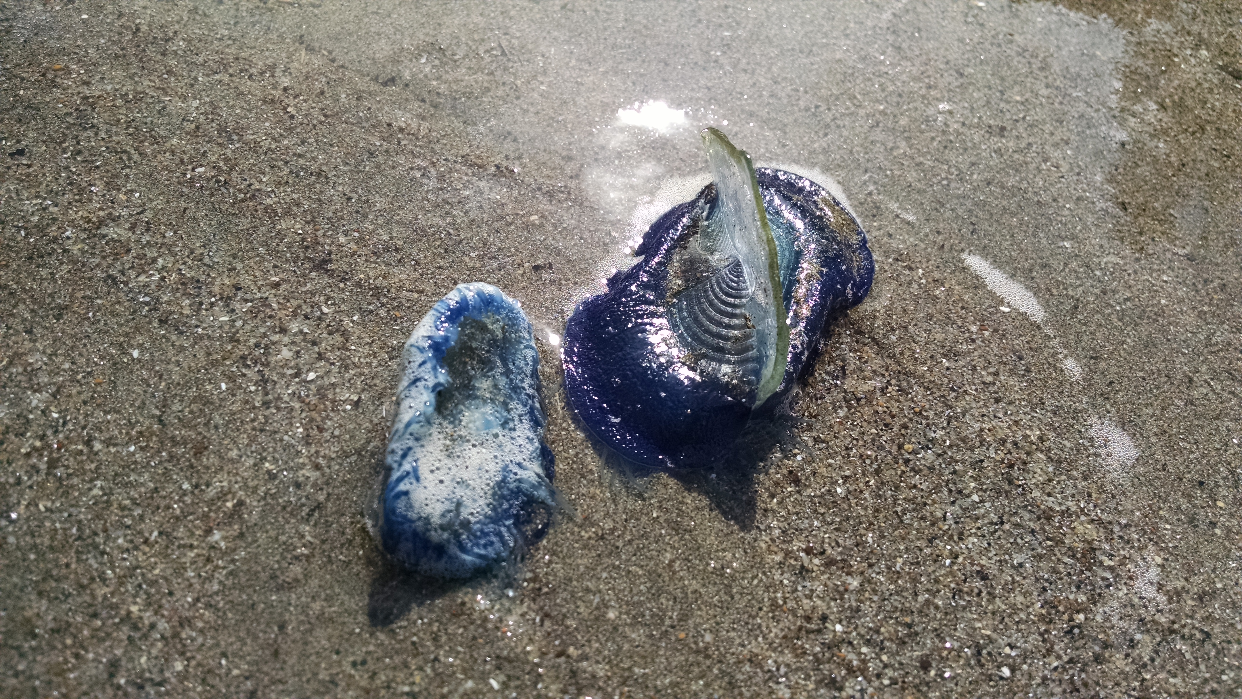 Saw a bunch of blue sail Vallela jelly fish washed up on the beach today at Sunset beach near Coos Bay Oregon. My daughter picked one up wondering what it was. There were a whole bunch on the beach as the tide was coming in.