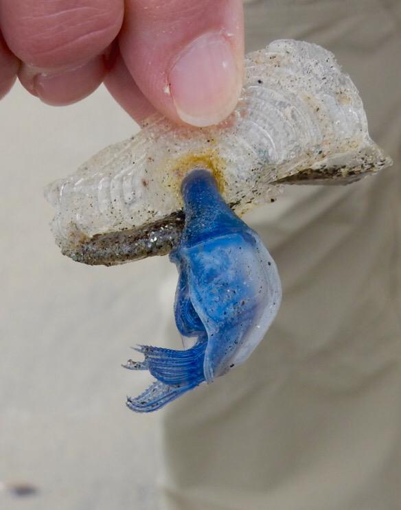 Blue gooseneck barnacle (Dosima fascicularis?) found growing on what looks to be the sail of Vellella vellella!