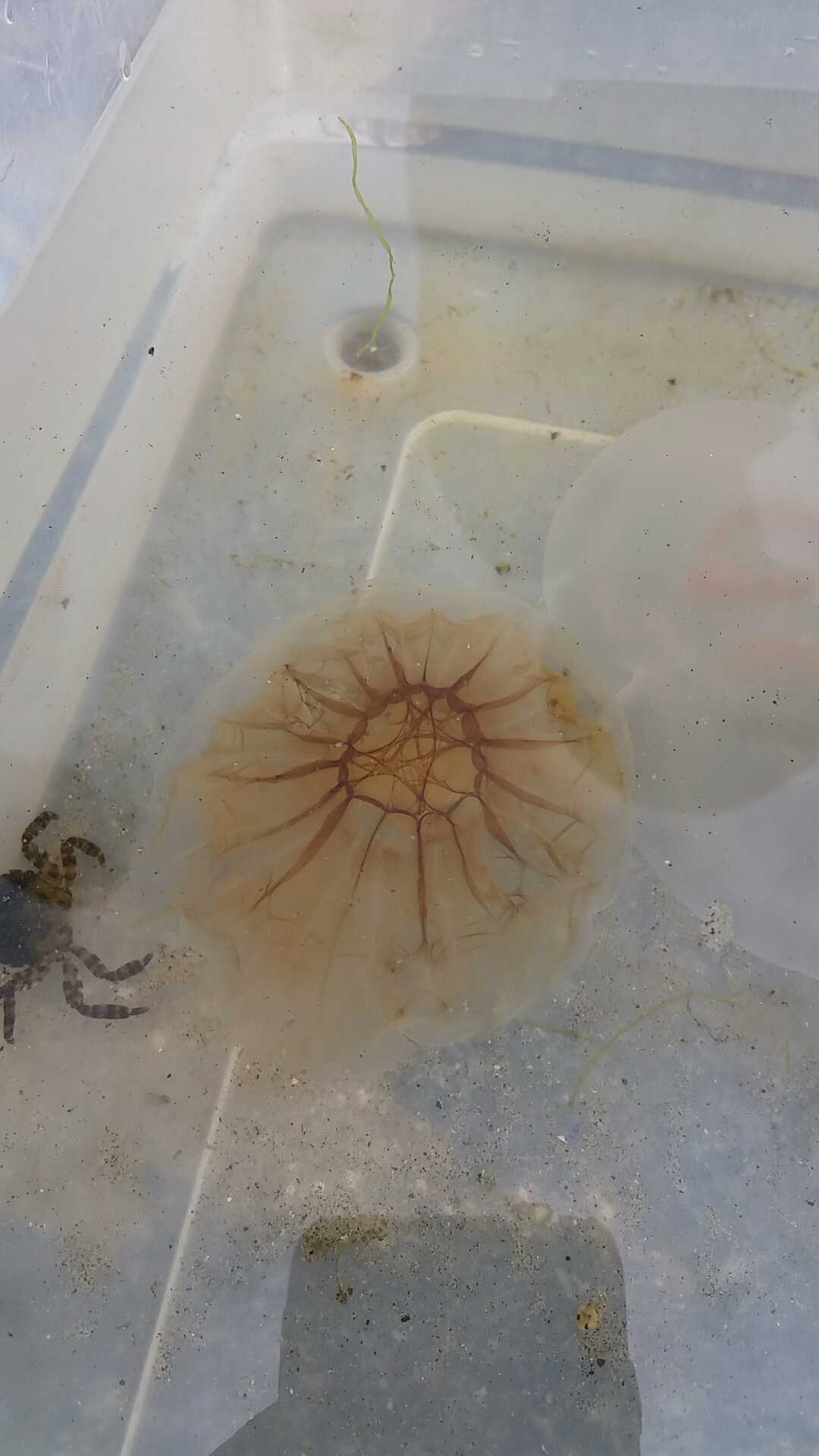 Looks like Chrysaora (or Cyanea?) on the left and Aurelia on the right. Thanks for sending!