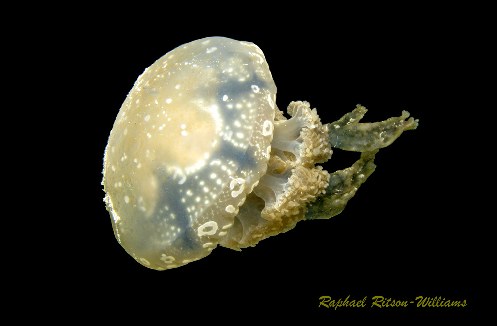 I found this jelly while snorkling at night in a shallow channel at the Hawaiian Institue of Marine Biology, Kaneohe Bay, Oahu, Hawaii.