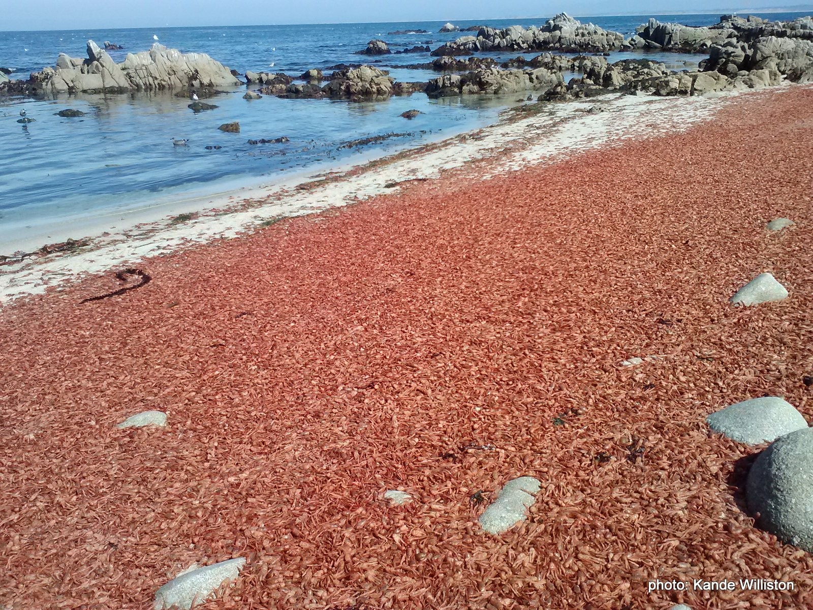 Pleuroncodes (also called tuna crabs) washing up near Asilomar, reported by Kande W. Sanctuary reports previous washups in 1959, 1969, 1982-1983.