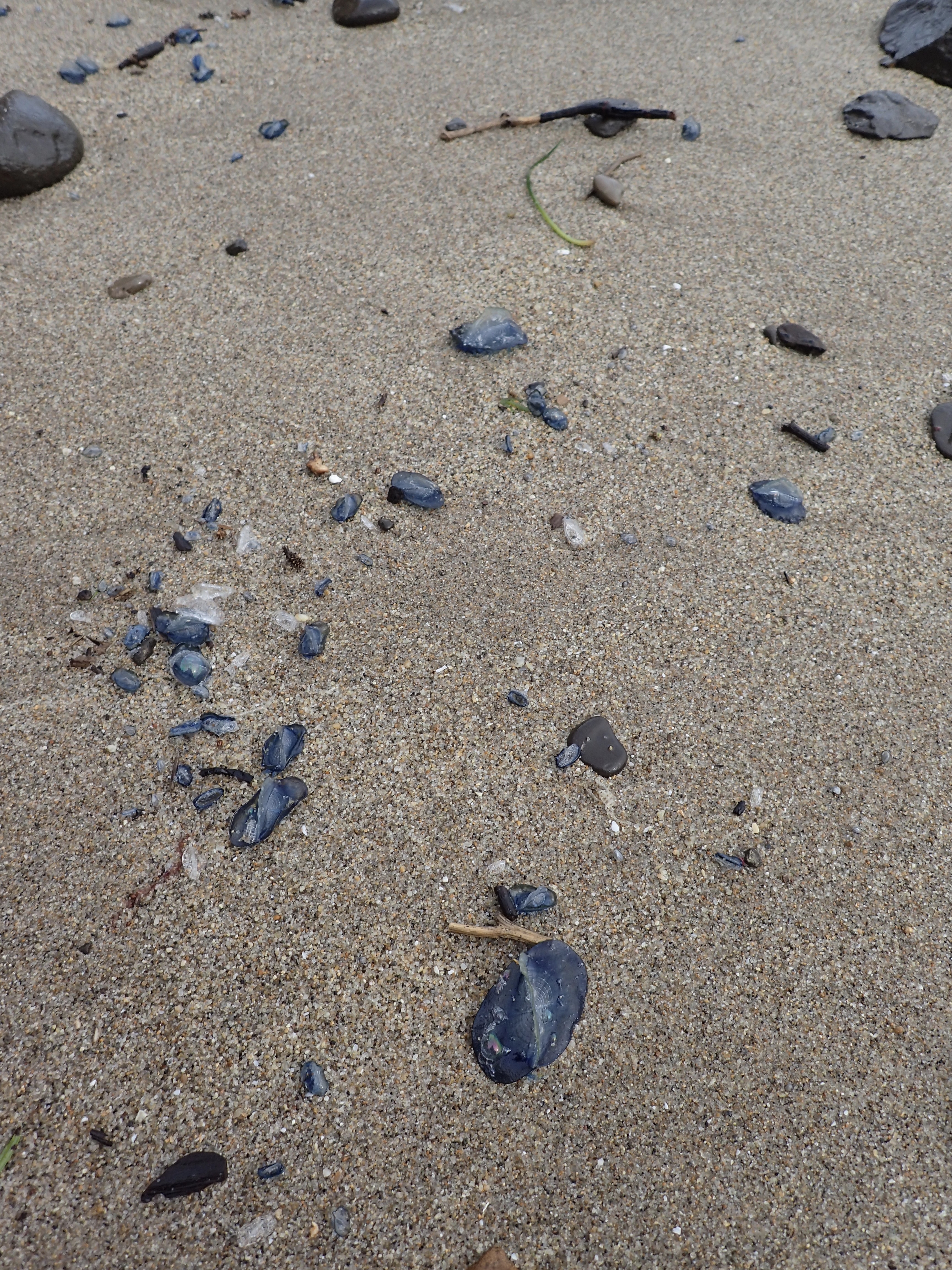 I saw many small Velella velella, ranging from <1 cm to 4 cm in length, at the high tide mark on Davenport Landing Beach.