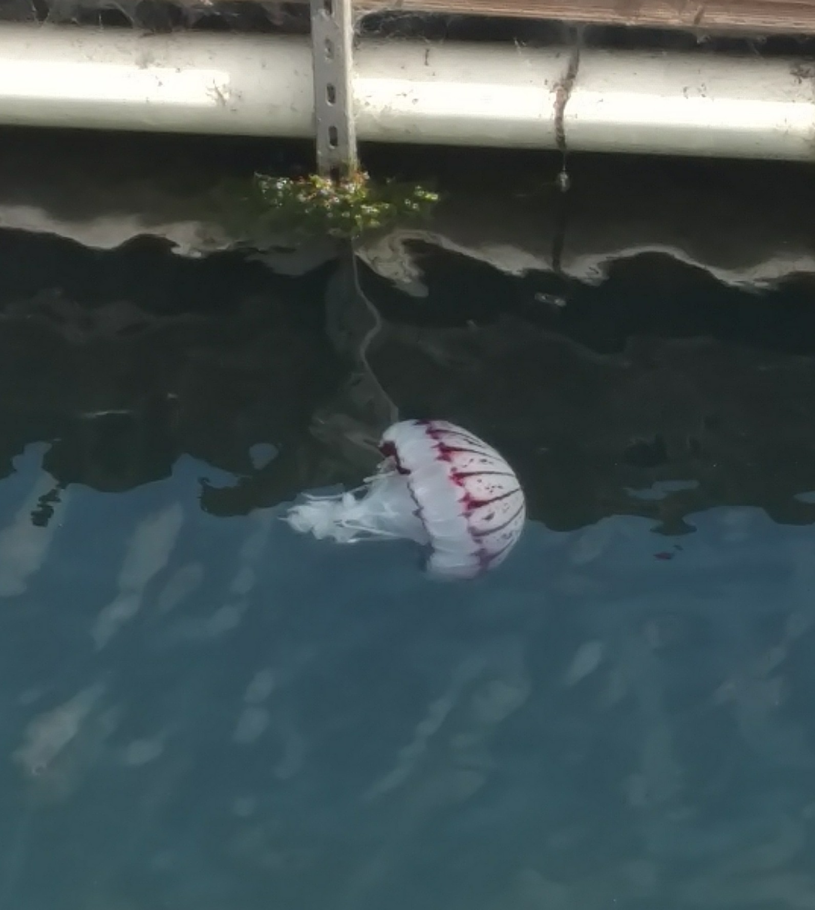 A white and purple sea nettle was at the boat docks next to fisherman's wharf in Monterey, Ca. It was in the gap between the docks and the walking trail.