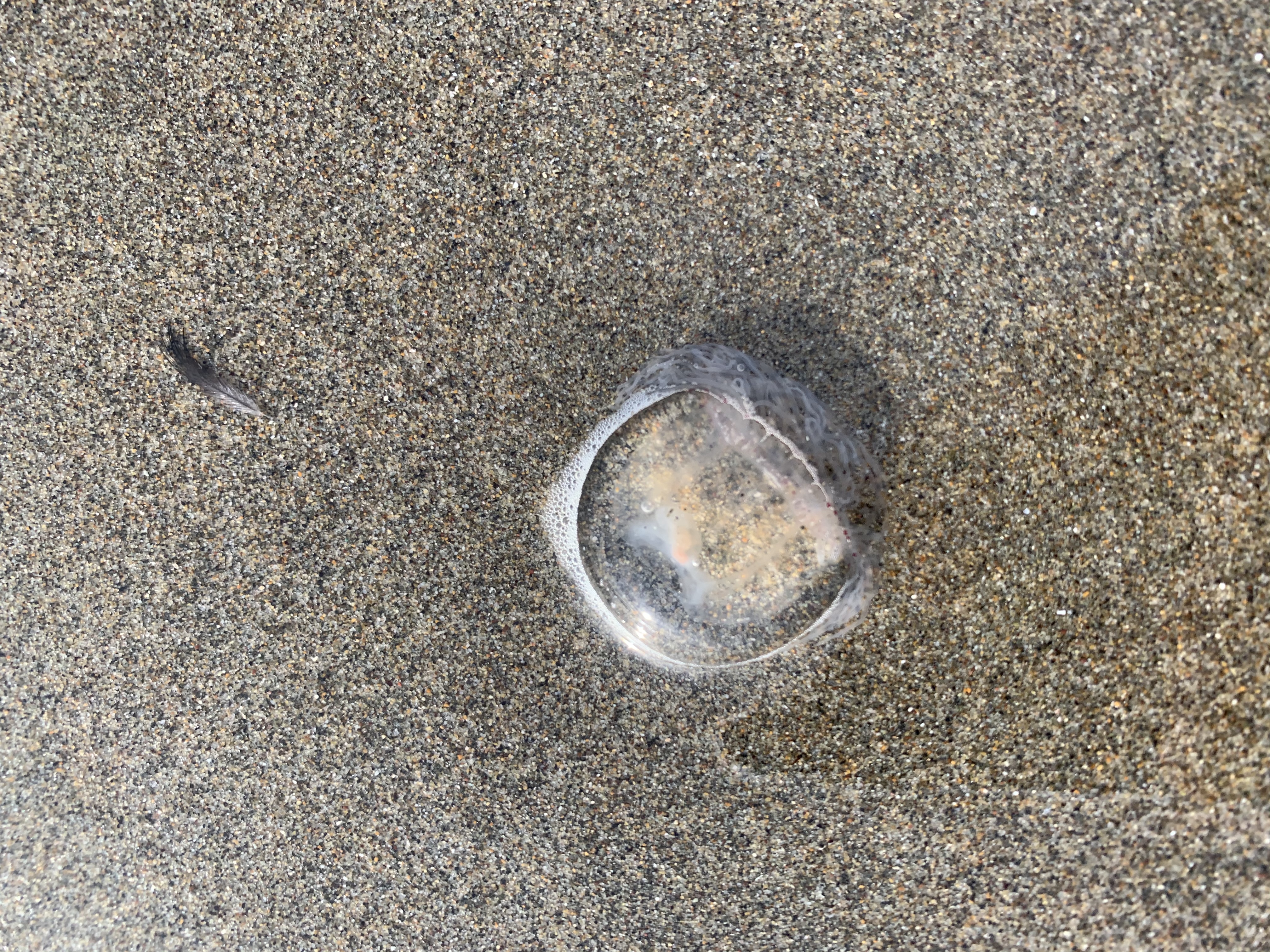 Saw about five or six gelatinous blobs washed up on Ocean Beach in San Francisco in the late afternoon. Largest one was about the size of a US half-dollar