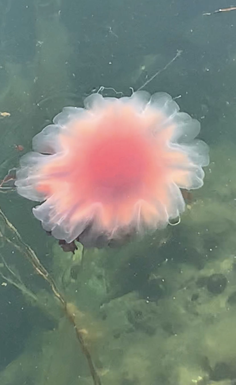Big Jelly for these parts. Got caught up in sea grass by my wharf. Freed it and off it went.