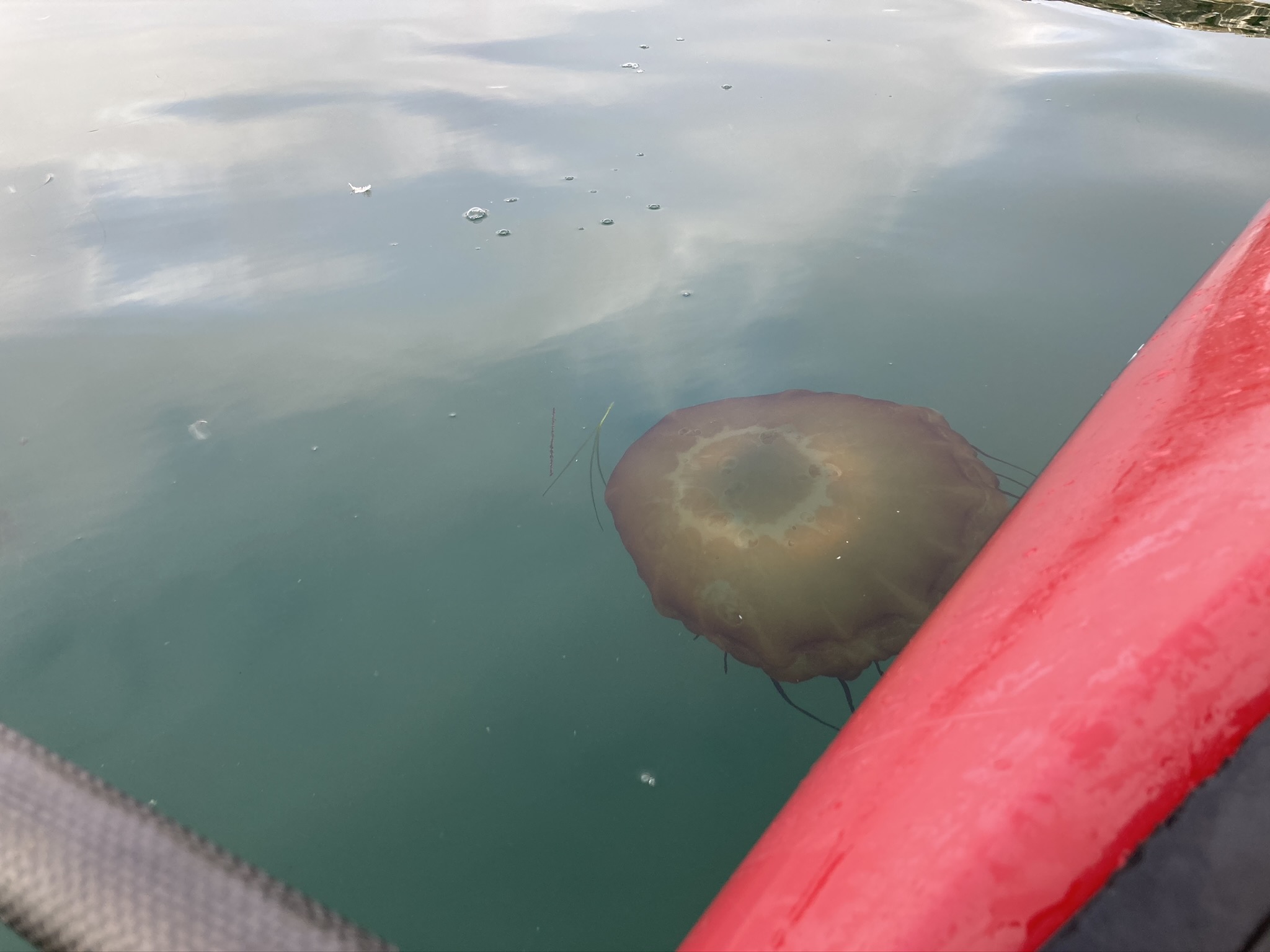 Saw brown striped jellies and moon jellies just outside the harbor mouth at Pillar Point, San Mateo county, CA
