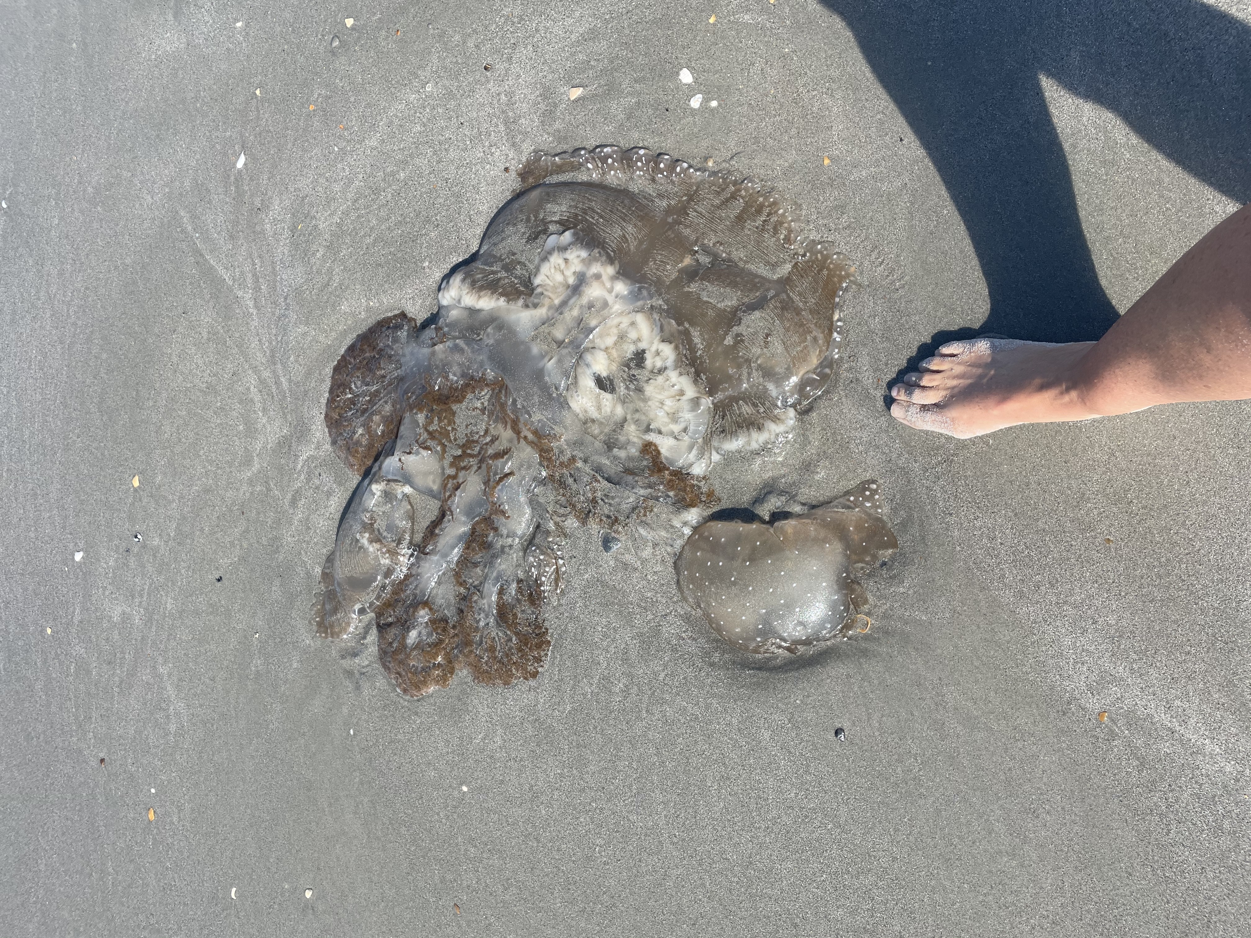It was washed up and partially buried in the rising tide but very very large. It was still pushing and assumed still alive.