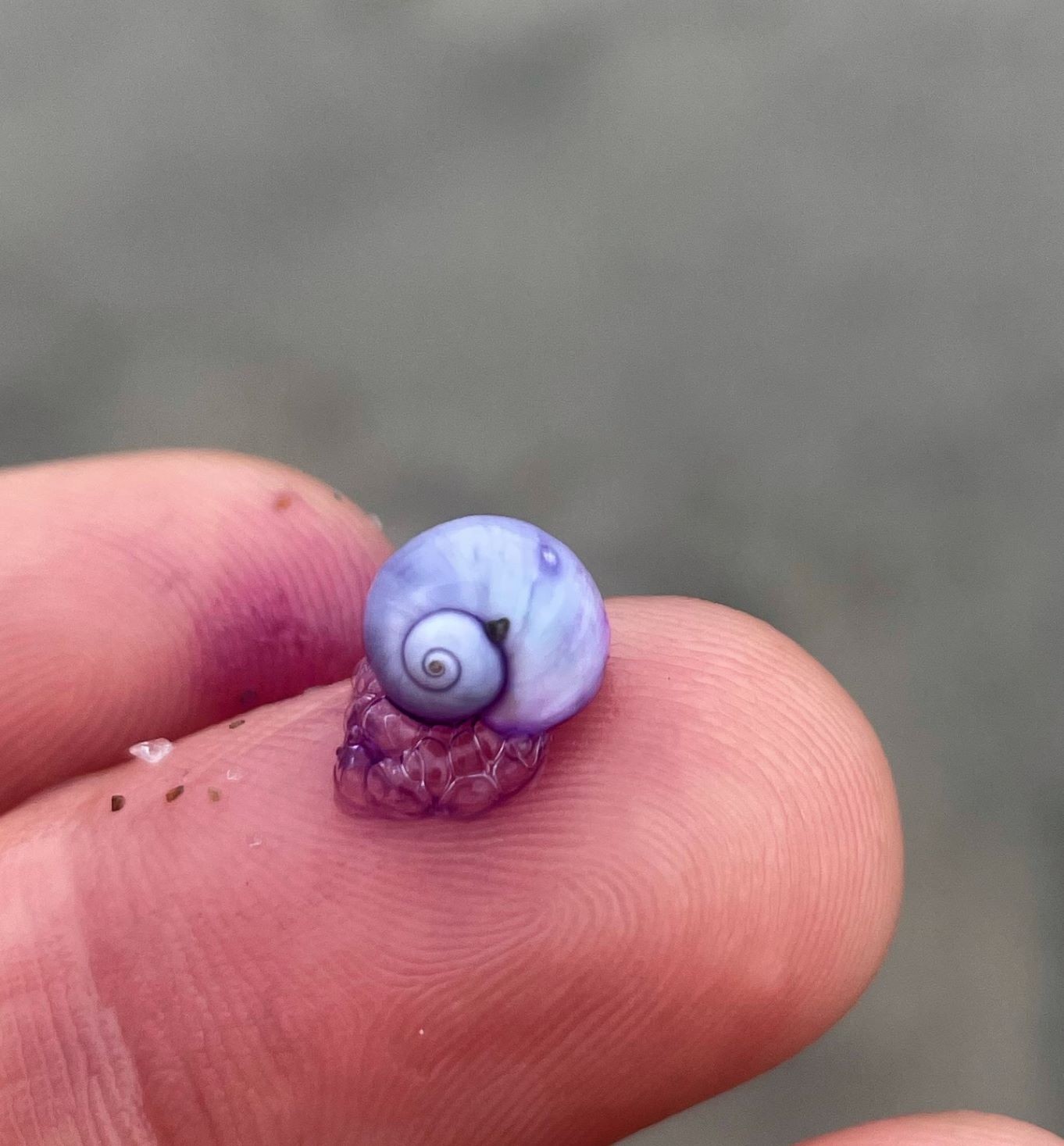Common Janthina snail with bubble raft, leaking purple fluid, found on a day that many Man O War were washing up on SE FL coast, strong east wind