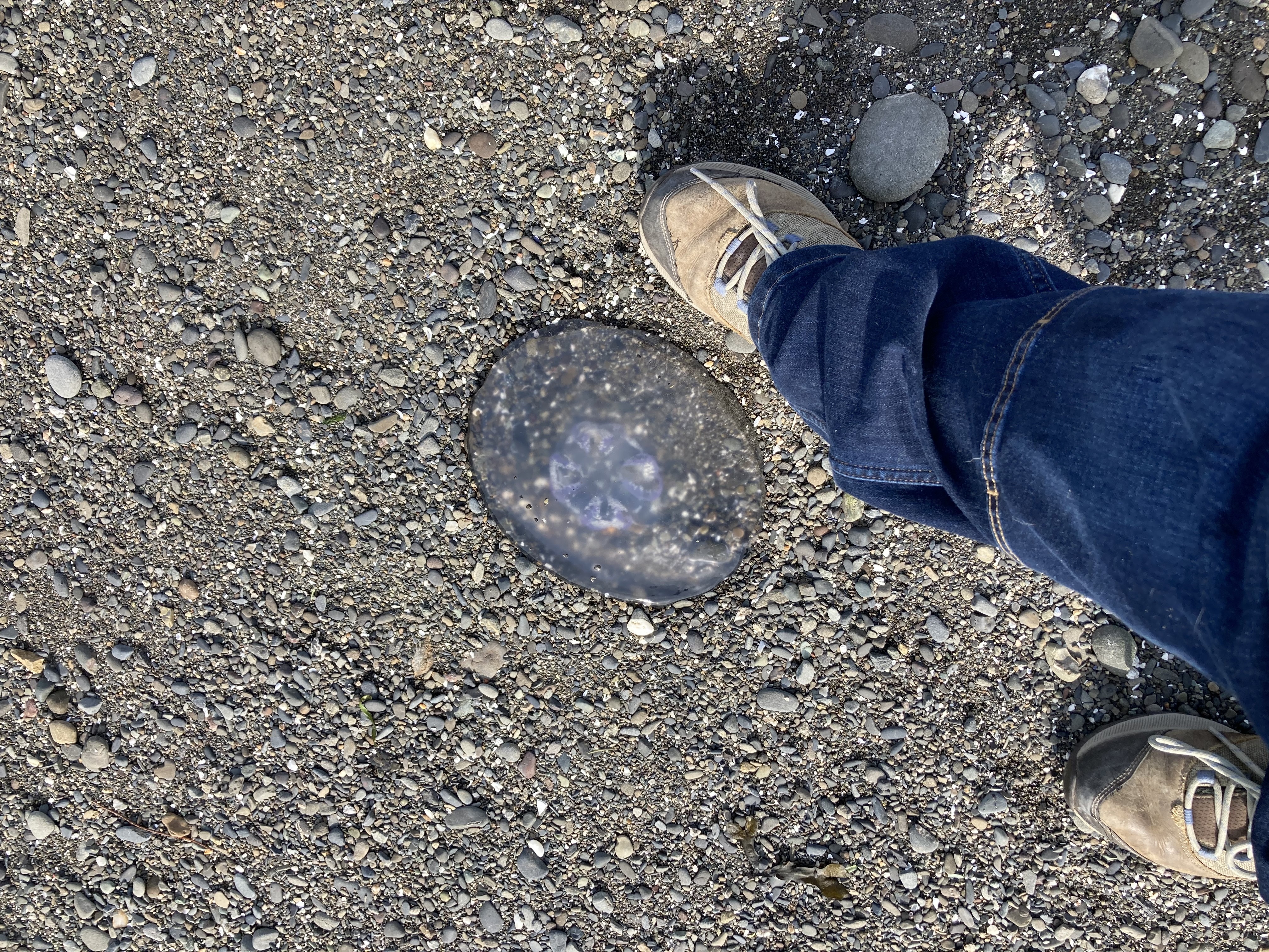 I counted approximately 10 along the high tide line. Most per approx. 10 inches in diameter. The horseshoe shaped gastrocavities had a purple hue.