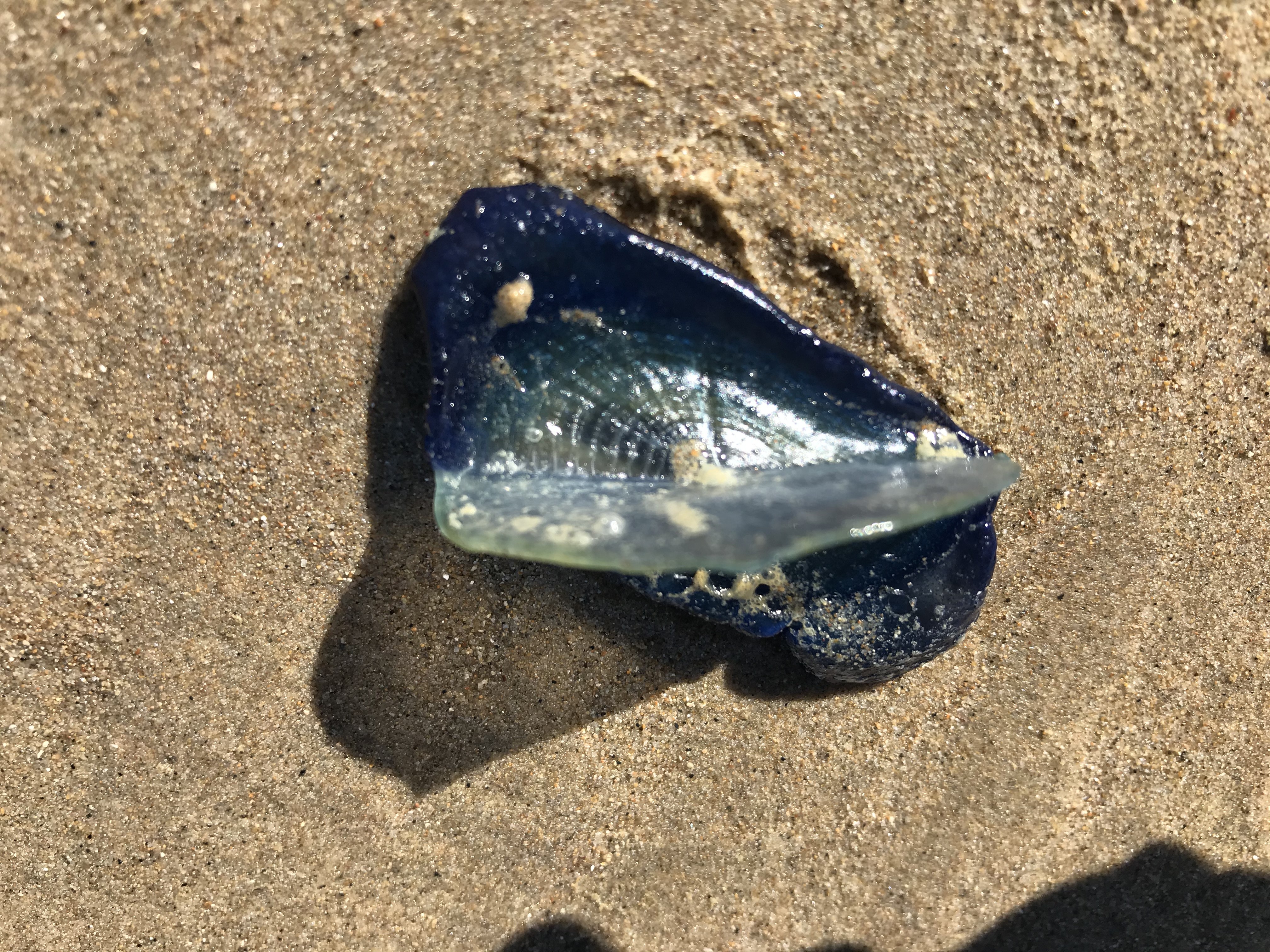 Little blue rafts with clear jelly-like sails were washed up on the beach. There were many, but not thousands, scattered up and down the beach.