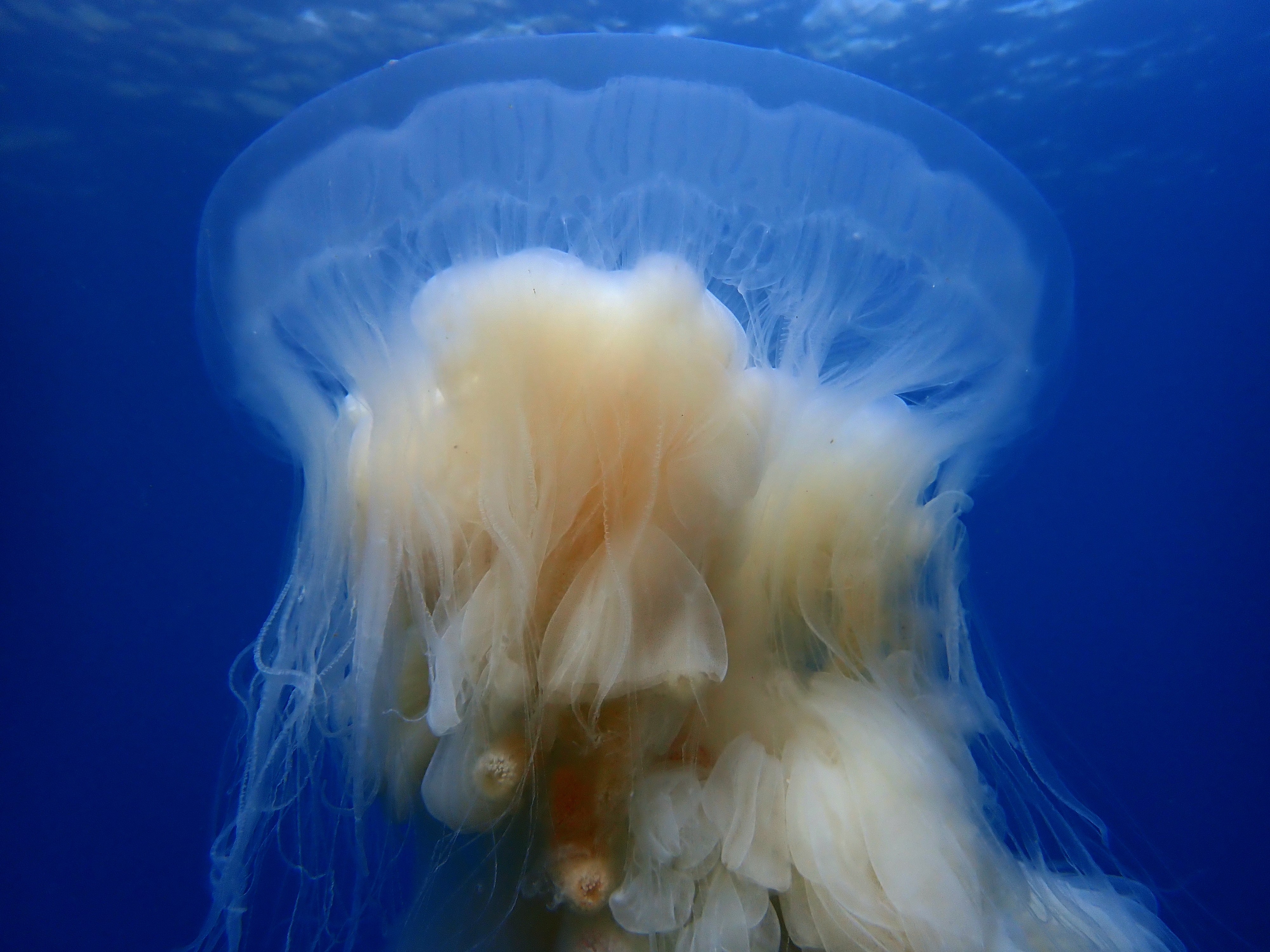 Little Flower Reef (32.839444, -118.368611), southeastern San Clemente Island, California: many Phacellophora camtschatica at the surface, in the water column, and moribund on the bottom; often feeding on the even more abundant pyrosomes.