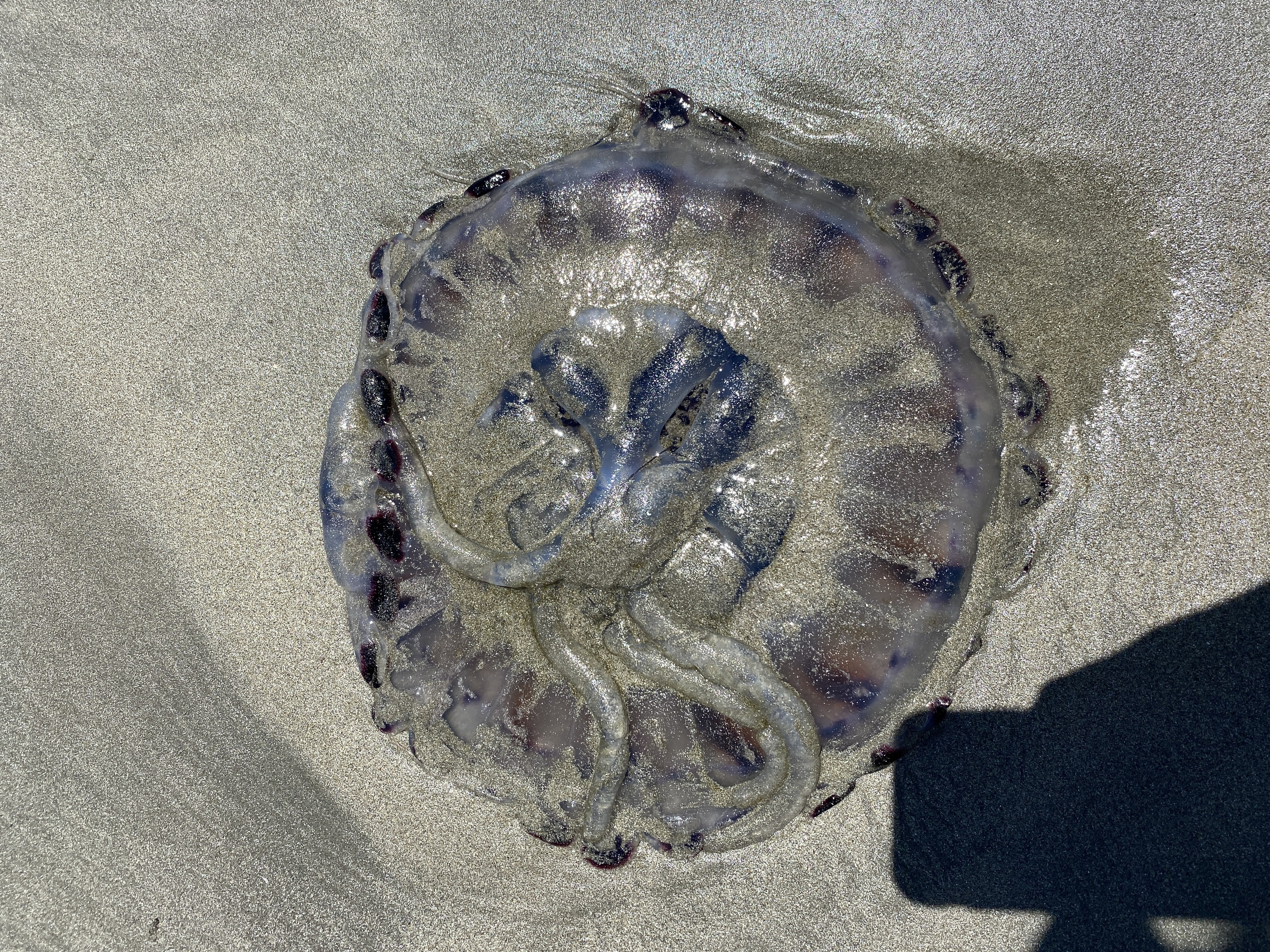 Washed up on Olde Port Beach in Port San Luis. Photographed at 12:42 tide was approx 2.7 ft. Dark red/purple stripes on top side of crown. Approx 12 inches across. Typically only see Velella and moon jellies on this beach. Lots of sea lettuce washed onto the beach during the high tide overnight before. I have a second photo with some of the top if you need it.