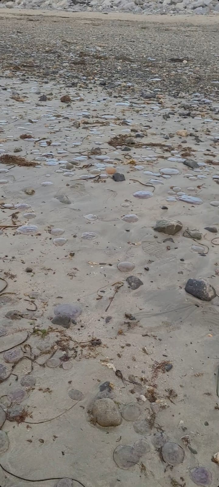 100s of Aurelia aurita and a few Chrysaora hysoscellastranded on beach in county Mayo, Ireland