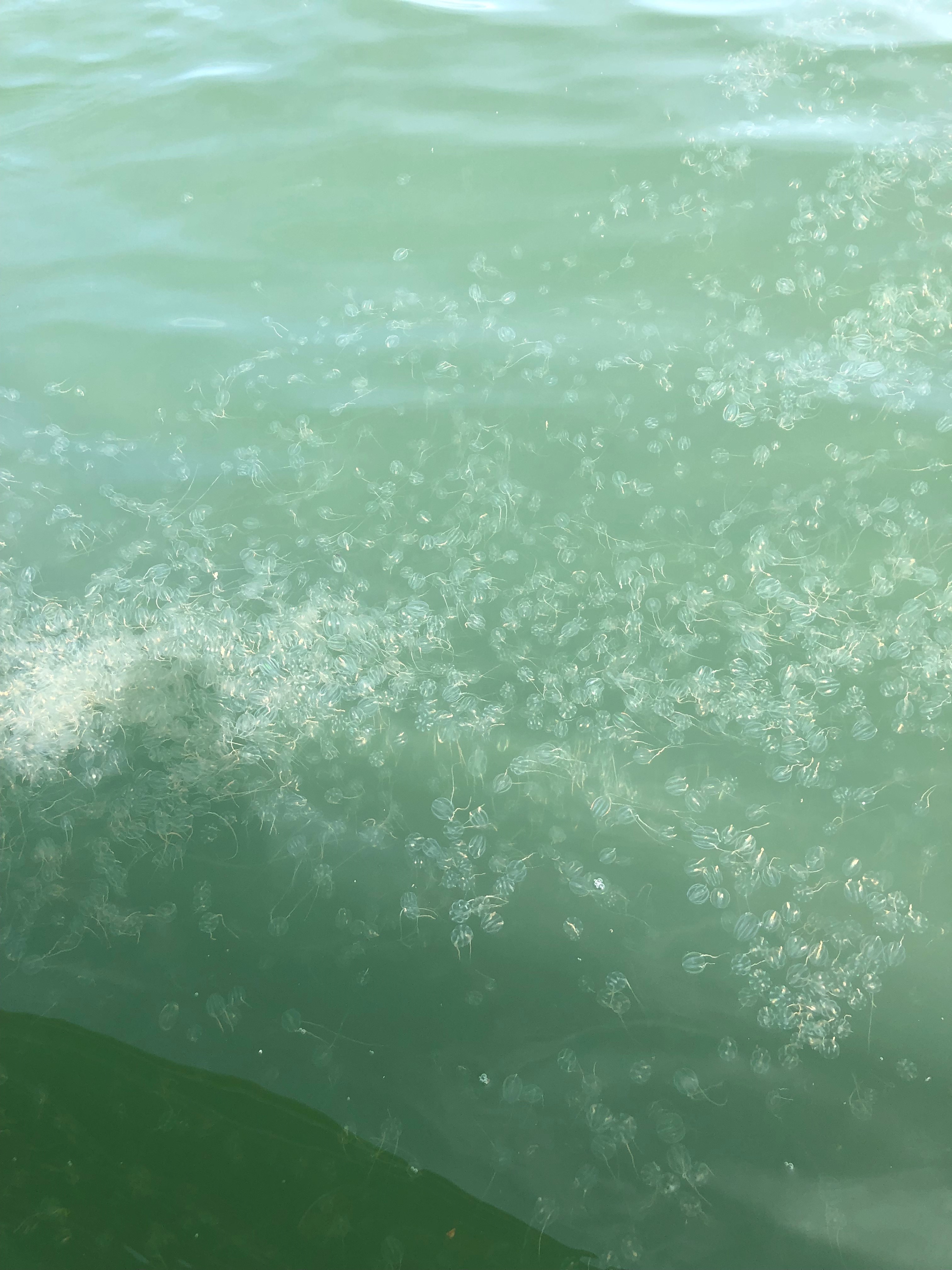 Dense aggregation observed from a boat near breakwater at the outer edge of New Haven Harbor.