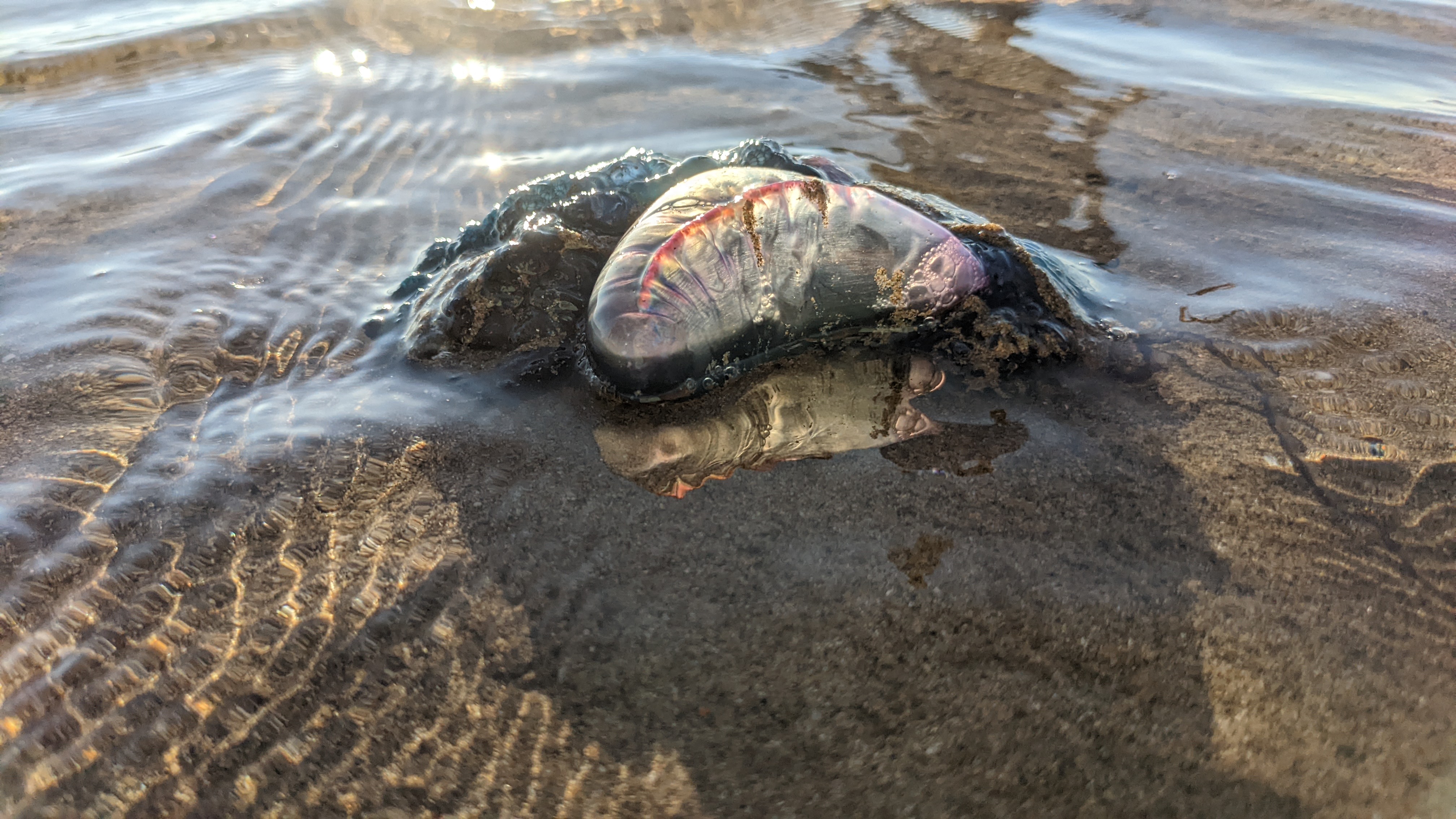 Walking along beach and came across many Jelly Fish, this included around 40 Moon Jelly Fish, 10 to 15:Compass Jellyfish and a Blue one and a Portuguese man o war.