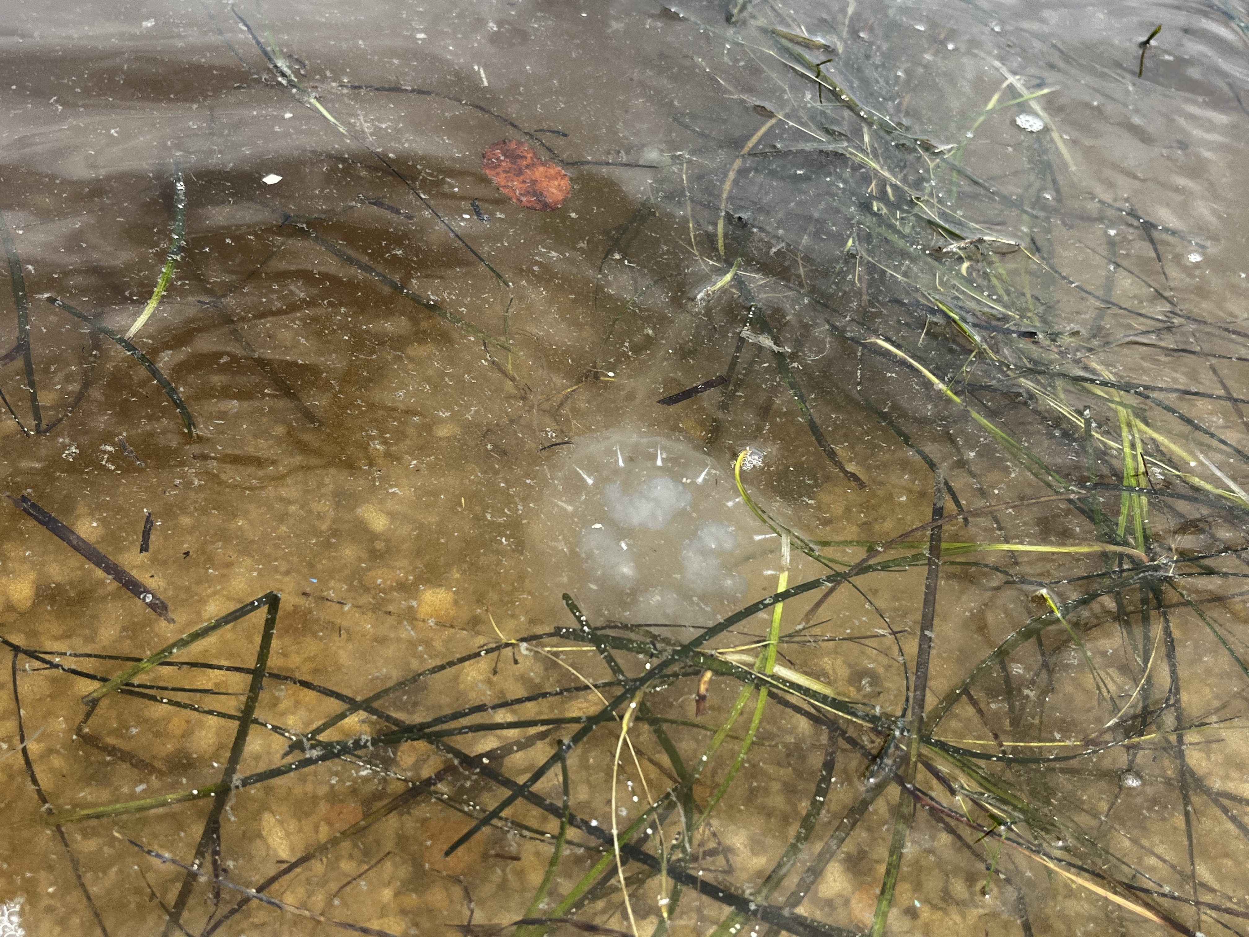 About 5-10 jellyfish along the shore of the Yorktown Beach