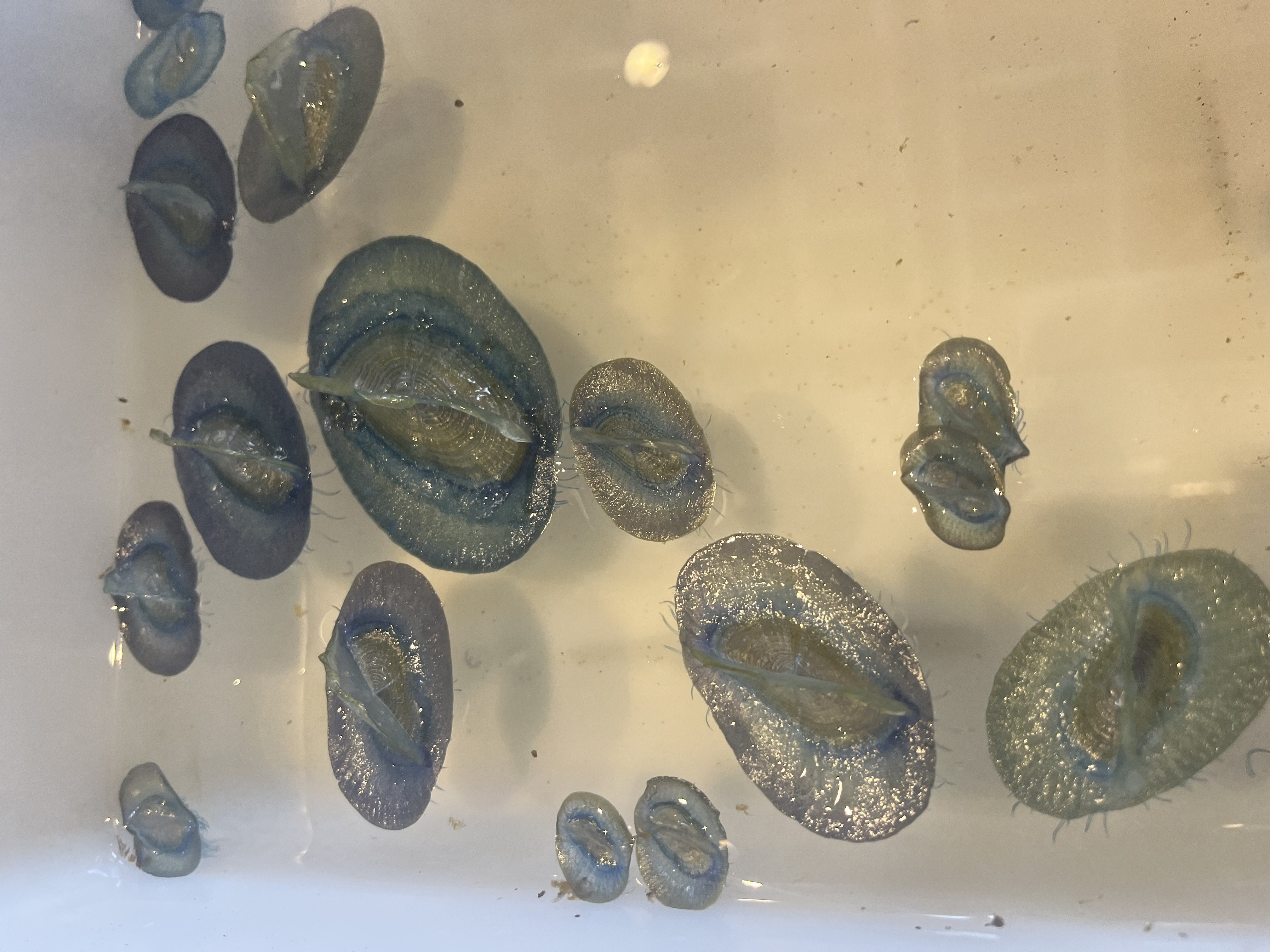 collected 20 by-the-wind sailors; all 20 were left-handed, and the rest in the water seemed to be left-handed as well. all of them were found off the coast in Santa Barbara near Stearn’s Wharf.
