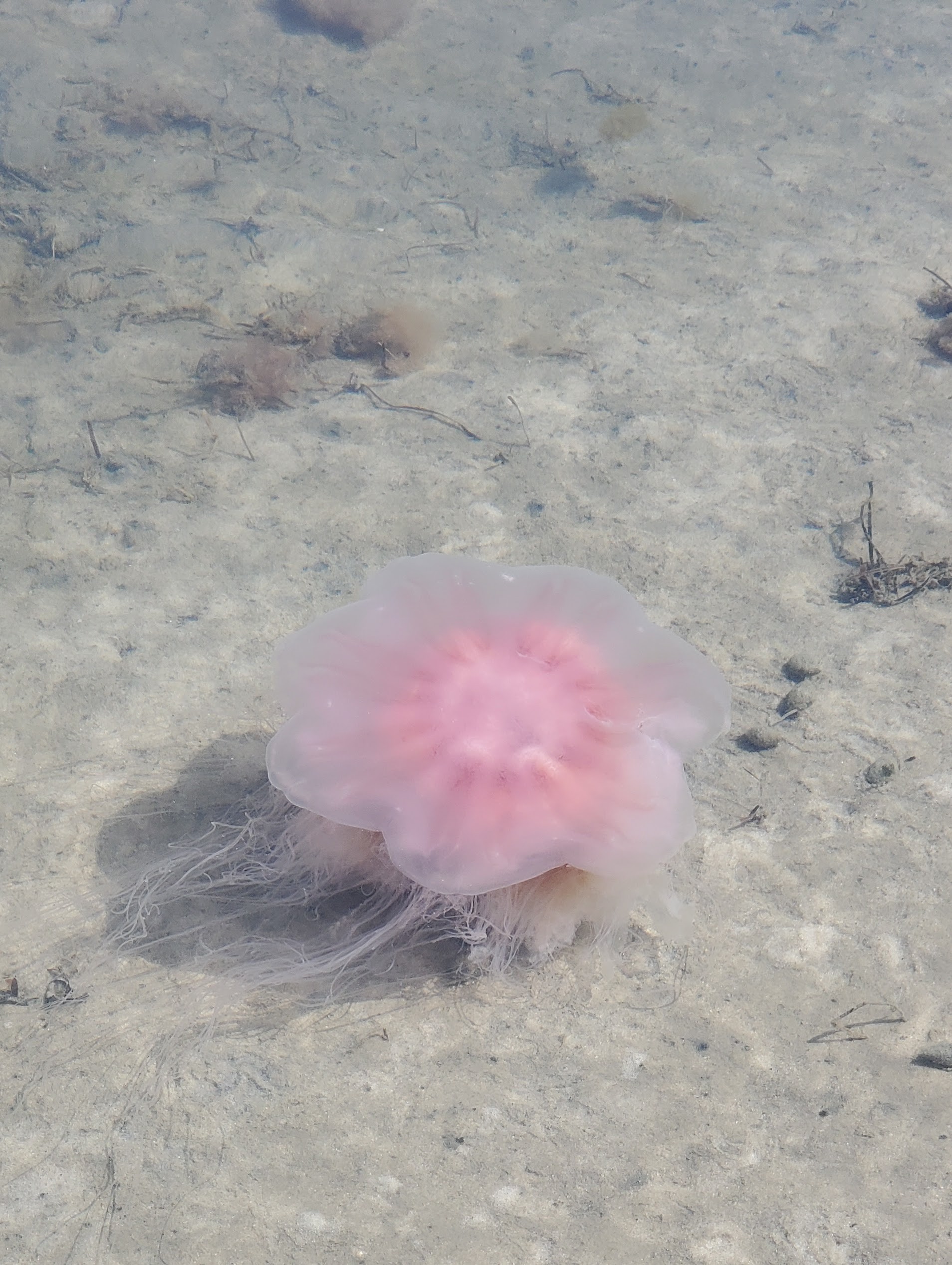 We were kayaking in very shallow water off Assateague Island National Seashore when we came across a single pink jellyfish near shore. We took a video and a photo with our phones. We aren't sure of ID. It was about 7-8 inches in diameter with 7 transparent lobes or scallops around its edge and a darker pink ring of depressions inside this. No clear gonads. The water was only about 8-10 inches deep off the coast of Great Egging Island in Sinepuxent Bay.