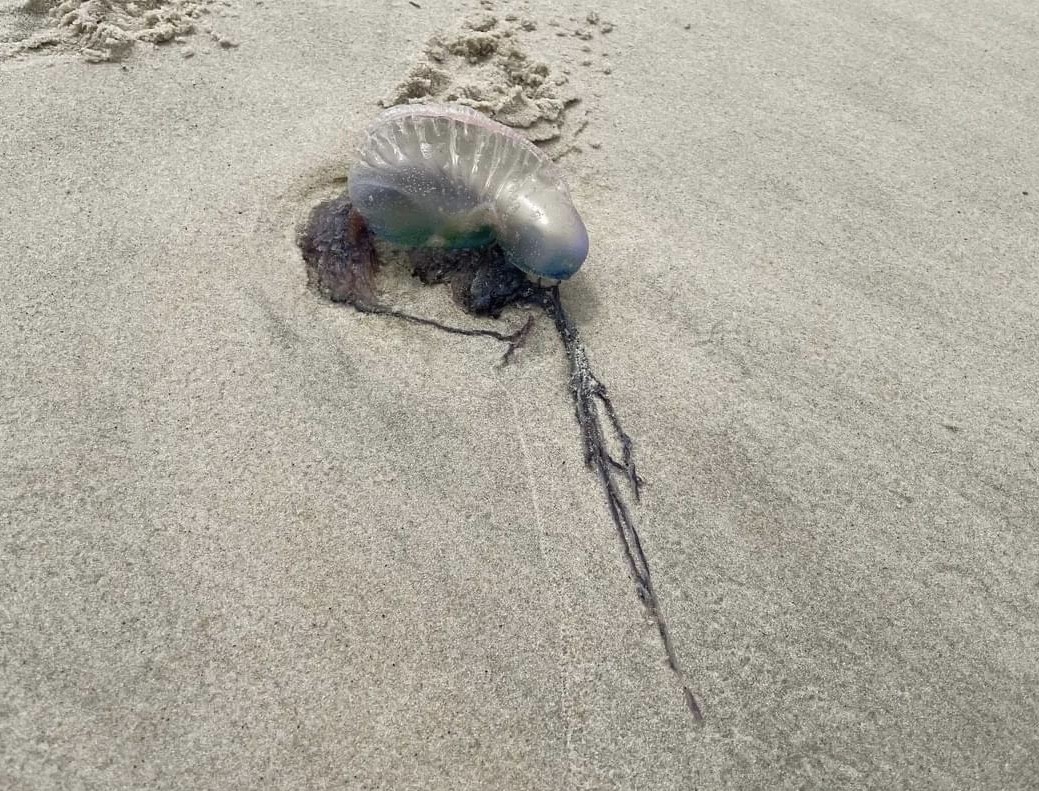 Two Portuguese Man o Wars have been spotted washed up on shore in Chick’s Beach. Another was spotted in the water near the rocks where the military base property begins. All have had the translucent pneumatophore filled with beautiful colors of blue, green and purple. The tentacles have been long and dark purple, almost black.